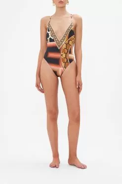 The Feeling Fresco Scoop Neck One PIece explores the soft curves lined with monogrammed moments paying homage to vintage scarf motifs. Crafted from ECONYL® regenerated nylon, this sustainable swim one-piece features a high-rise silhouette to elongate the leg, a scoop back detail and crystal embellishments. A sophisticated printed one piece, designed for chic resort style swimwear. Lovingly crafted, designed in Australia. Explore more from Amore Mio collection.