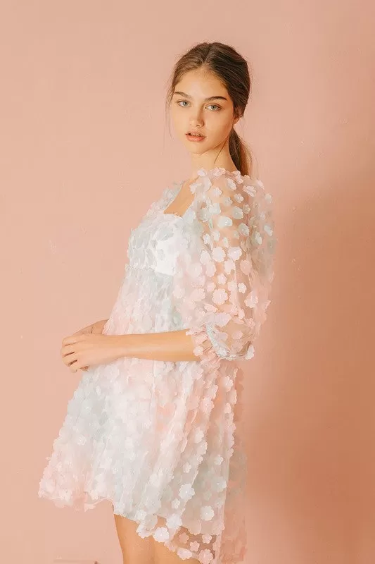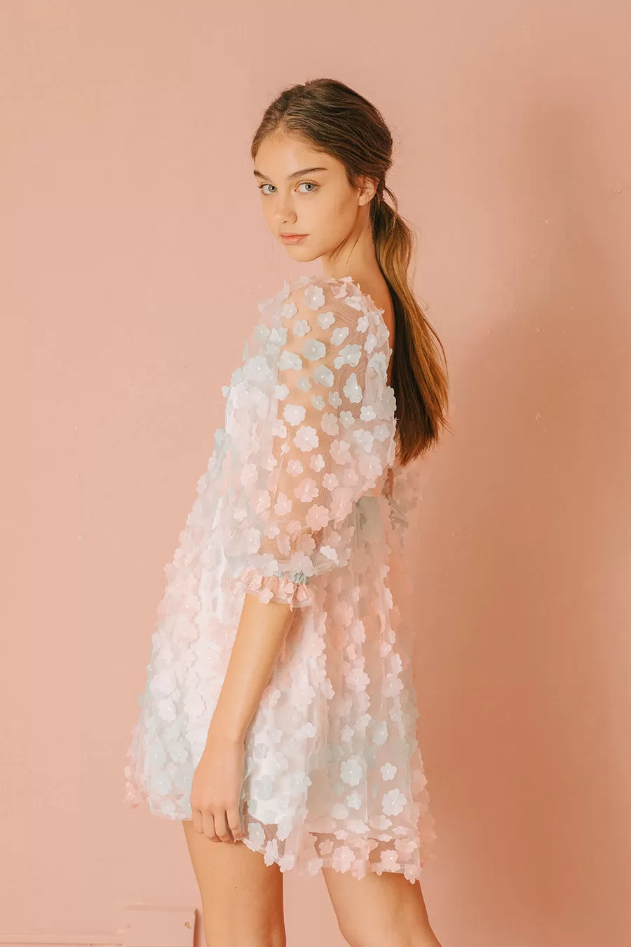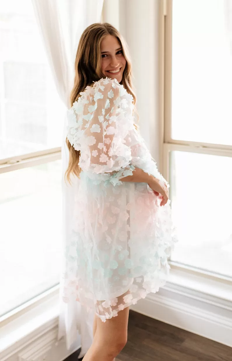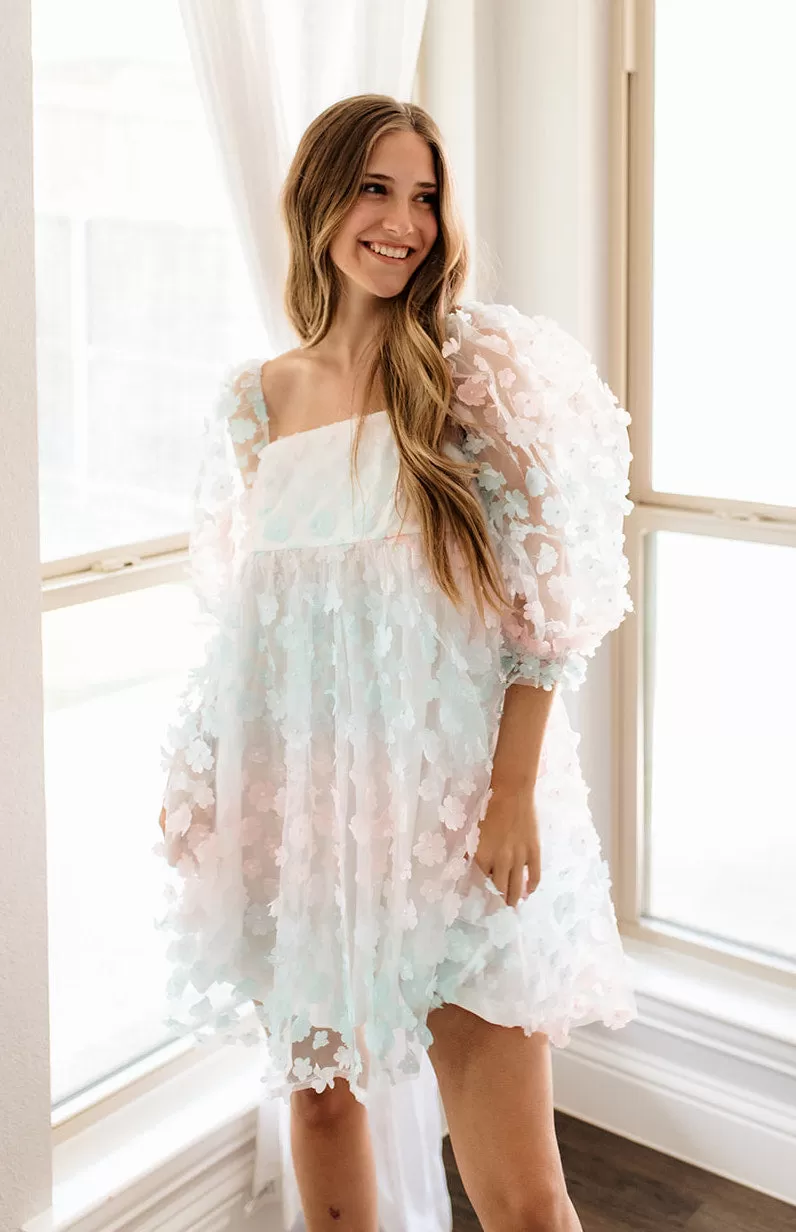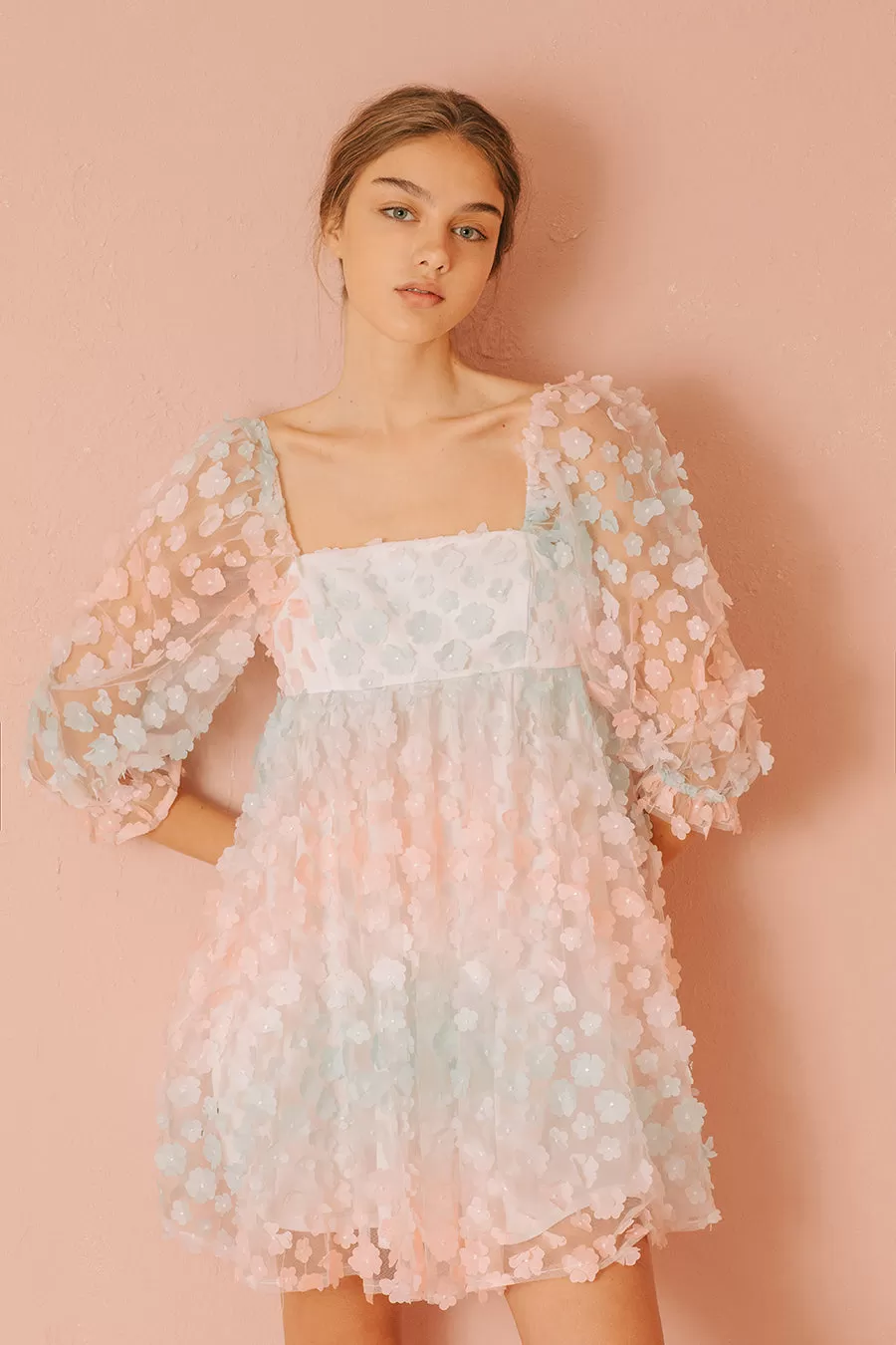 //Best Seller// Our She’s Like Spring Tulle Babydoll Dress comes in the cutest silhouette & fabrication! This tulle base and pastel floral 3D print dress has ¾ puff sleeves and a concealed back zip closure. The 3D daisy give it that much detail!
