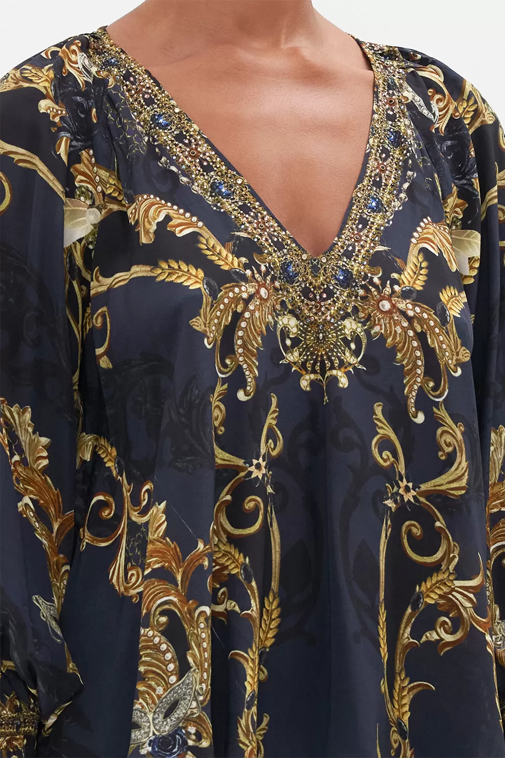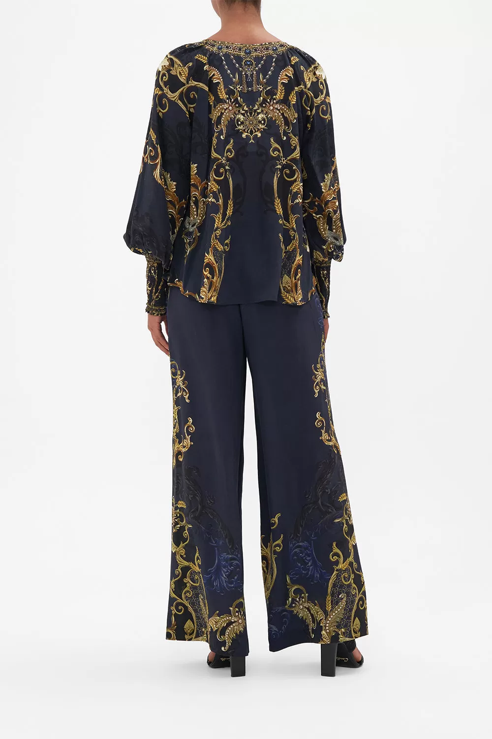 The Moonlight Melodies Shirred Cuff Blouse delves into an arrangement of gold and deep ebony flourishes highlighted with strands of chains, pearls and diamond motifs. Complete with hand-embellished CAMILLA crystals, this luxury silk blouse is home to billowy blouson sleeves, a deep v neckline that meets an intricate amulet, shirring details at the cuffs and a relaxed silhouette made perfect for French tucks. Lovingly handcrafted and designed in Australia, explore more from The Moral Of The Story: Act II collection.