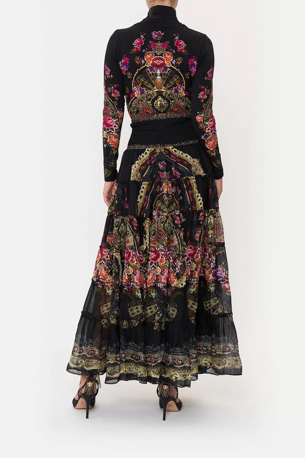 Wrapped in the whimsy of Spanish bohemia, the Dance With Duende Shirred Waist Tiered Circle Skirt is encased by midnight hues, opulent gold fans, bouquets of botanicals and golden cascades. Crafted from multi-tiered layers of silk, this luxury maxi skirt features a generous shirred waist that defines the body, a high-rise fit to elongate the legs and a full-length hem.