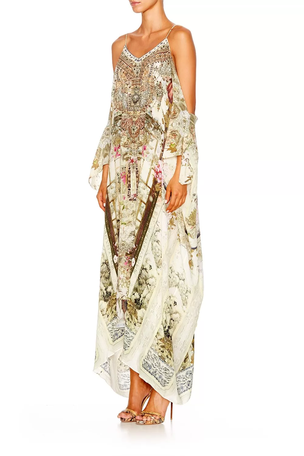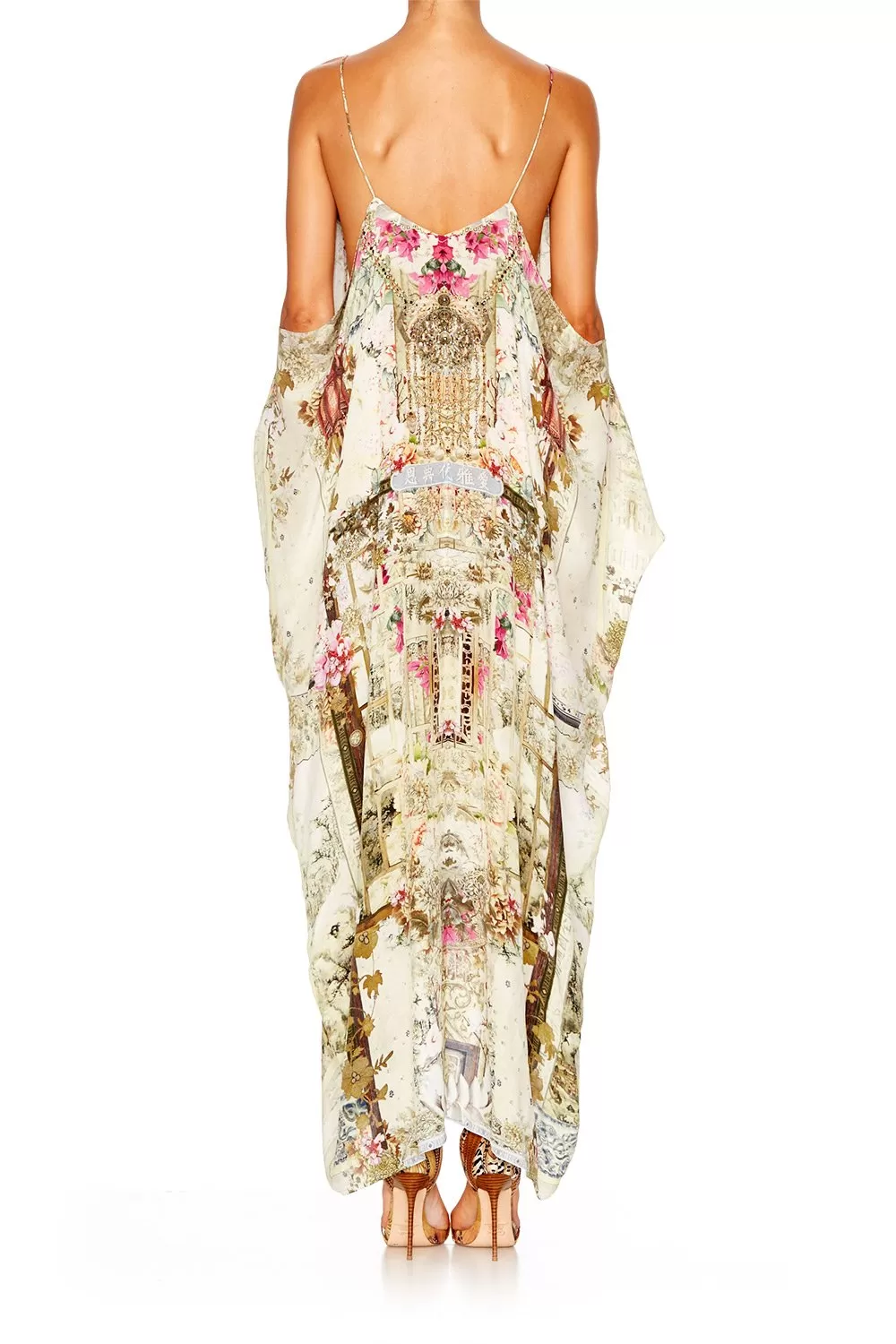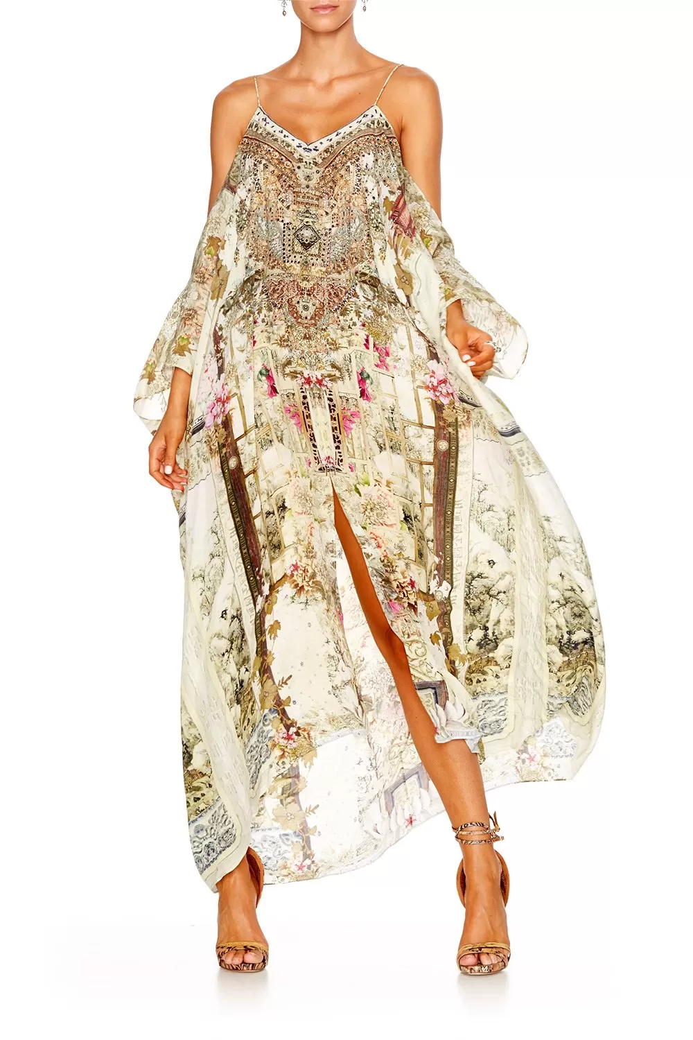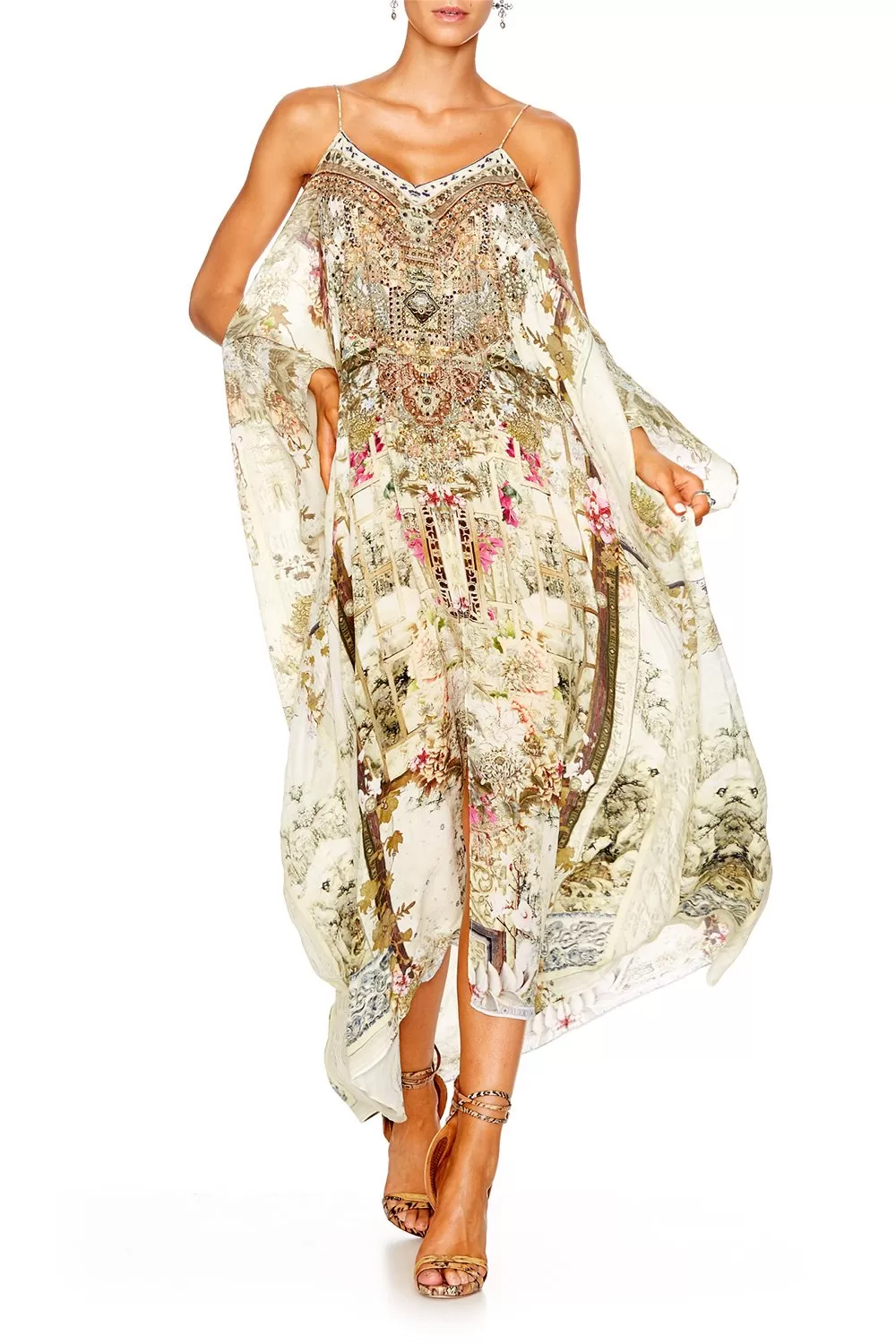 Bright and beautiful, floral and feminine; the Shoestring Strap Kaftan combines elegant patterning with a capacious, oversized silhouette. Inspired by the secret gardens of China, this striking piece features a billowing cut, shoestring straps and a split to centre front and sleeves. Wear yours over your favourite or for a bohoemain beachside look, or team with a to cinch in the waist and couple with strappy for an effortlessly elegant luxury resort wear ensemble.
