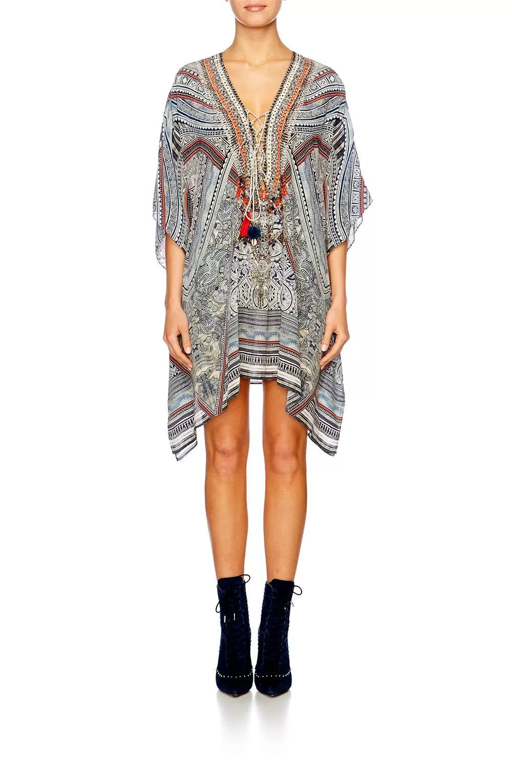 With patterning that draws its inspirations from the works of Chinese Batik artisans, the Short Lace Up Kaftan balances bold prints with a relaxed silhouette. Featuring delicate, hand-applied crystals to neckline, a pure silk construction, short sleeves and a deep V-neck, this luxury resort wear piece can also be worn as a fitted halter neck dress. Wear yours simply as a sarong over a or for the ultimate bohemian, beachside look.