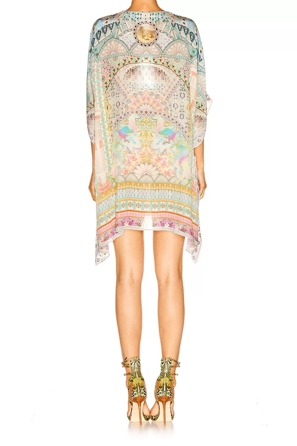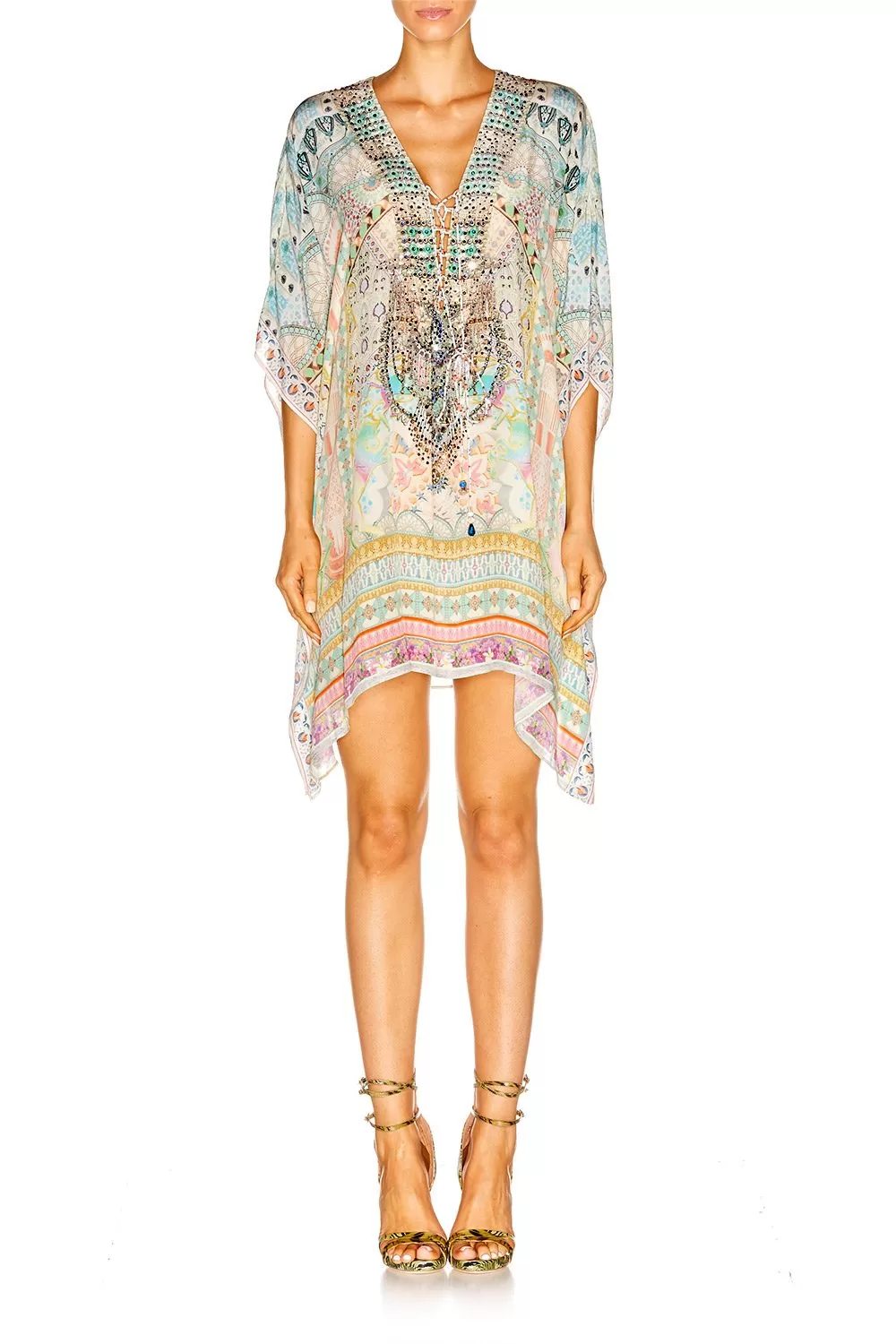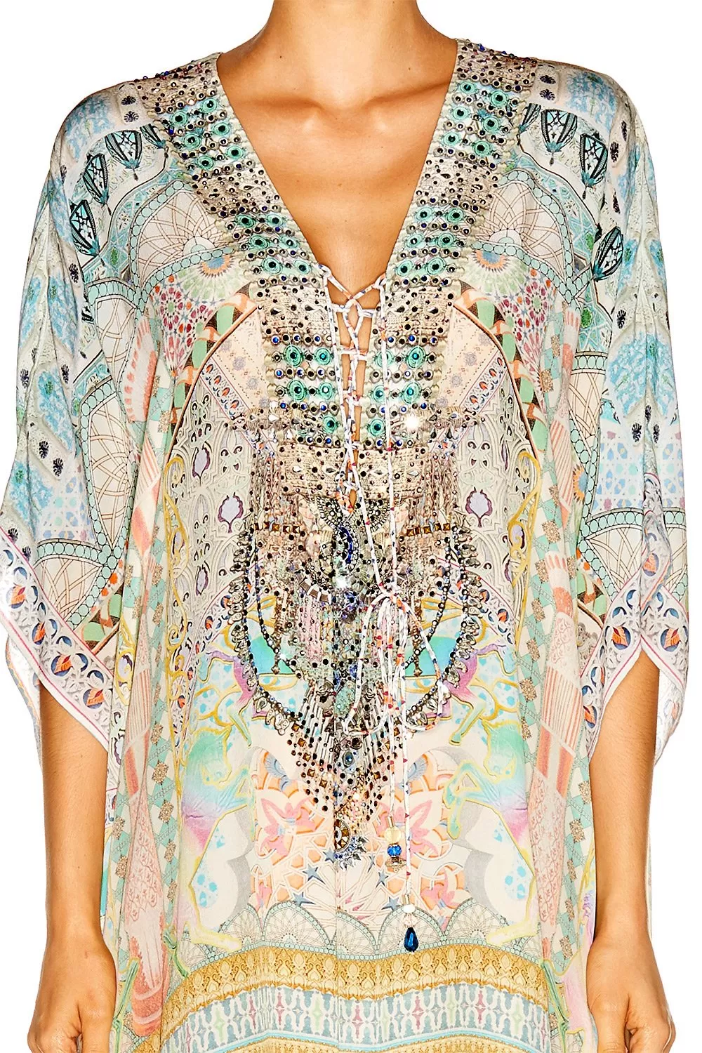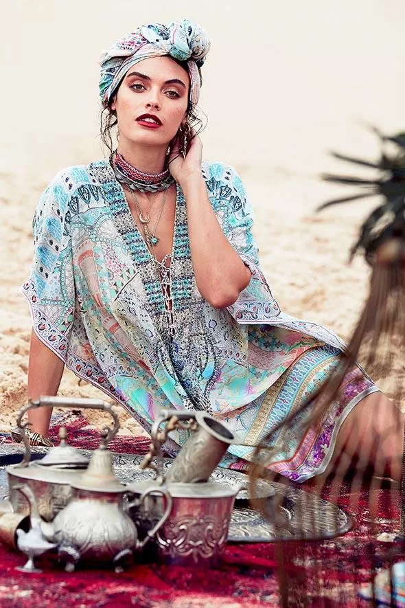 The My Dubai Dream Short Lace Up Kaftan combines feminine patterning with a soft and relaxed silhouette. Featuring a deep-V cut with lace up detailing, this luxury style offers a contemporary twist on the classic kaftan shape and draws its inspirations from Camilla’s travels to beautiful Dubai. Wear yours with soft and a vibrant , or take advantage of this multi-wear piece and style as a fitted halter neck dress.