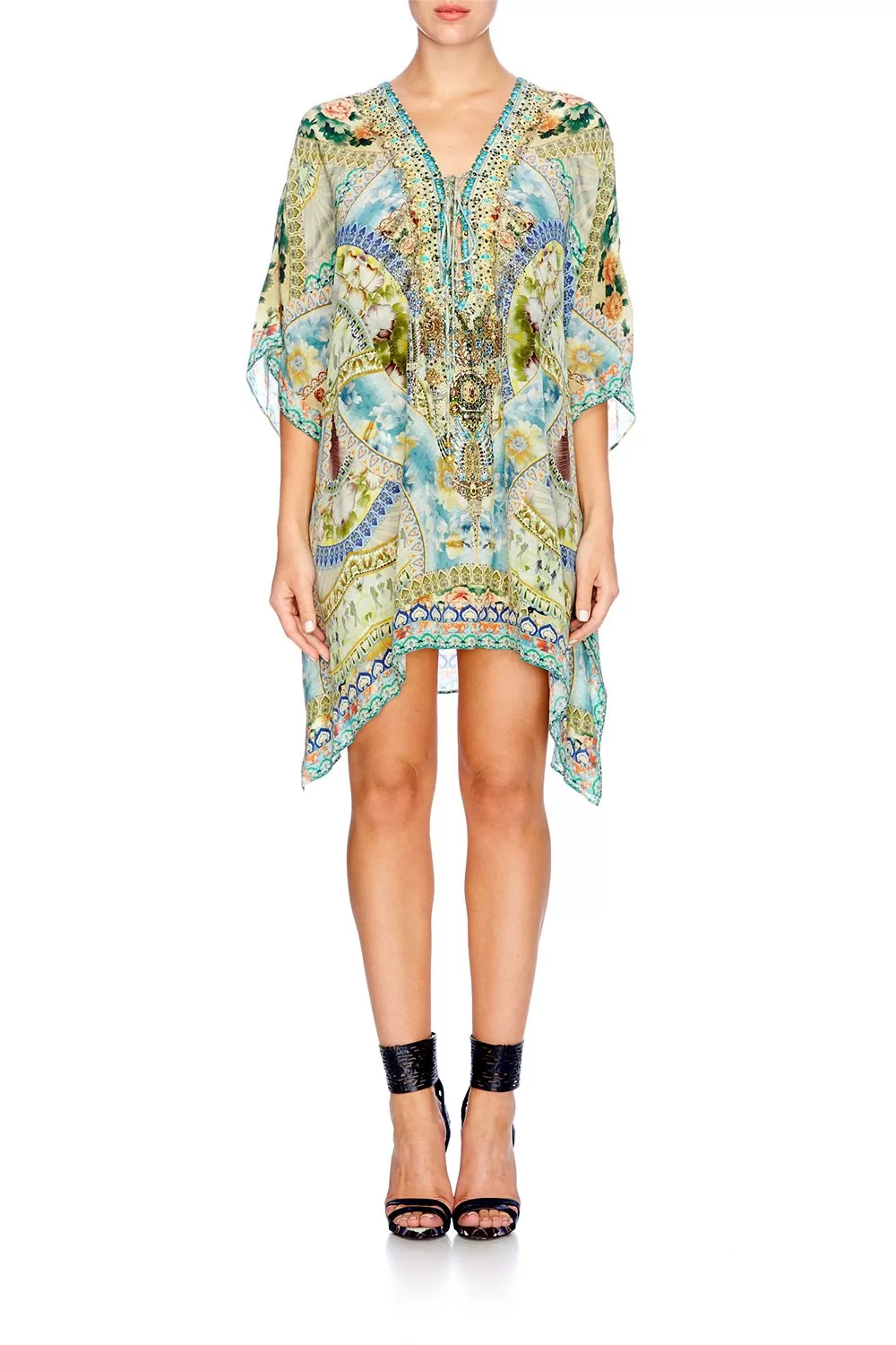 The Sign of Peace Short Lace Up Kaftan combines bold, intricate patterning with a soft and relaxed silhouette. Featuring a deep V cut with lace up detailing, this luxury style brings a contemporary twist to the classic kaftan shape. Team yours with and a , or take advantage of this its multi-wear qualities and style it as a fitted halter neck dress. This elegant piece is heavily influenced by the headiness of traditional Chinese market places, offering a whimsical, free-spirited vibe.