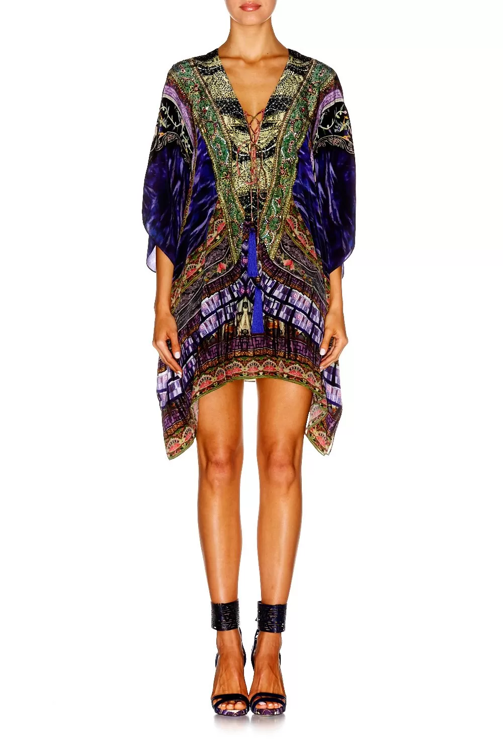 The Threads That Bind Us Short Lace Up Kaftan combines bold patterning with a soft and relaxed silhouette. Featuring a deep-V cut with lace up detailing, this luxury style offers a contemporary twist on the classic kaftan shape and draws its inspirations from ancient Chinese heirlooms that are passed from generation to generation. Wear yours with soft sandals and a vibrant headscarf, or take advantage of this multi-wear piece and style as a fitted halter neck dress.
