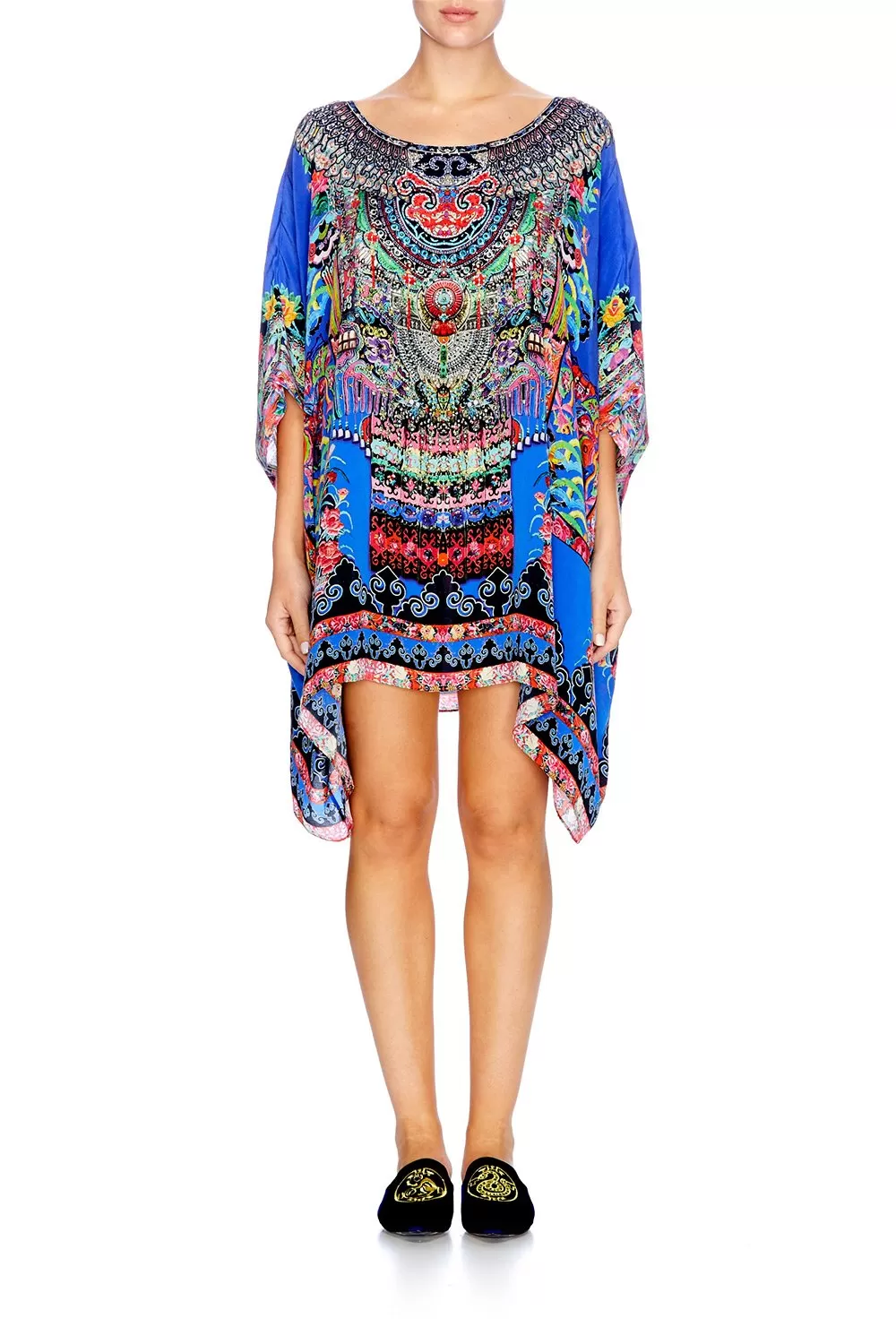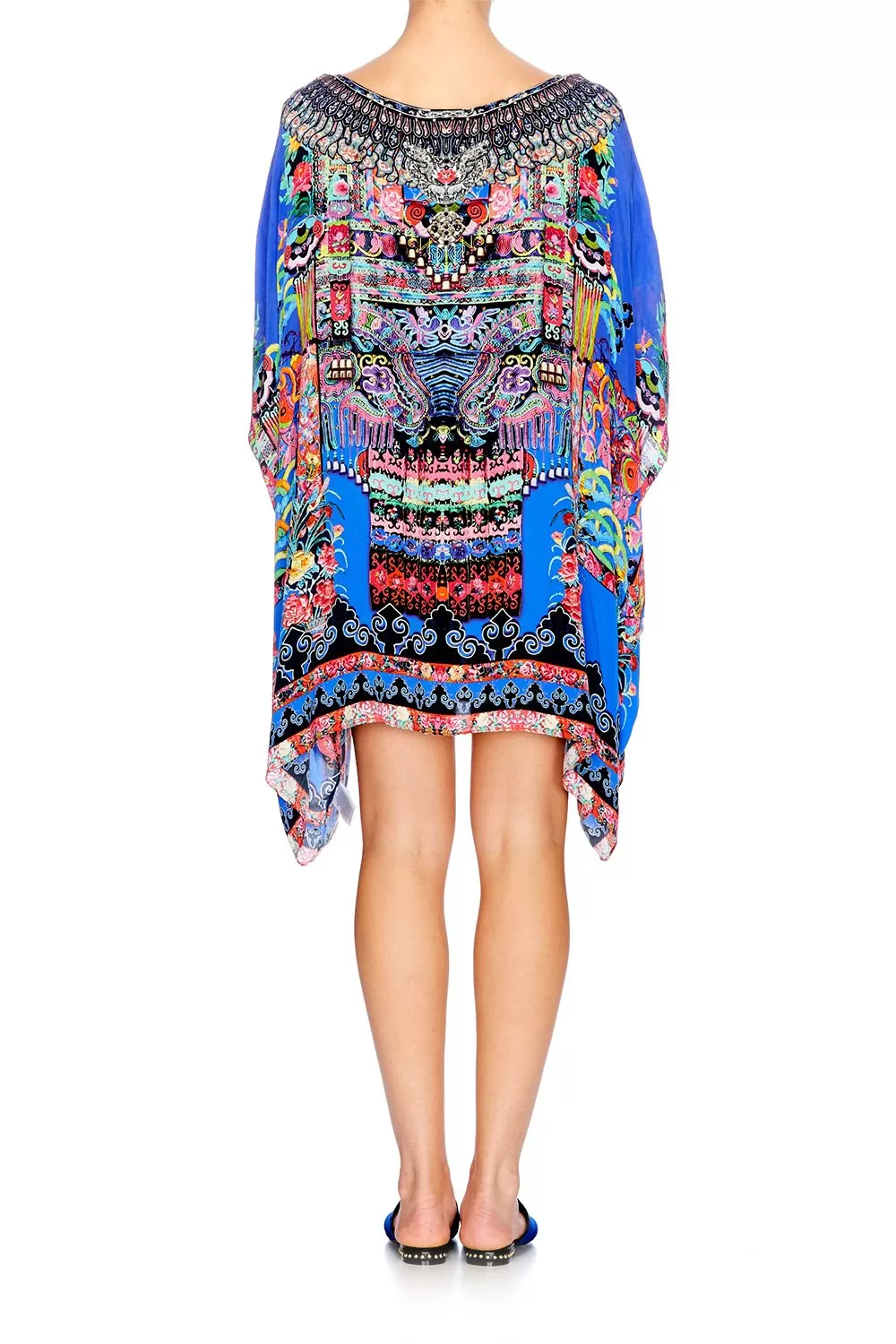 A signature CAMILLA style, the Short Round Neck Kaftan in our exclusive Pretty Precession print will lend a classically boho style to your beachwear wardrobe. Inspired by the welcoming nature of traditional Miao women, this kaftan boasts crystal embellishments to front and back neckline and fullness at hem for an effortlessly balanced silhouette. Use a to cinch in the waist and bring this piece into the evening by adding statement and .
