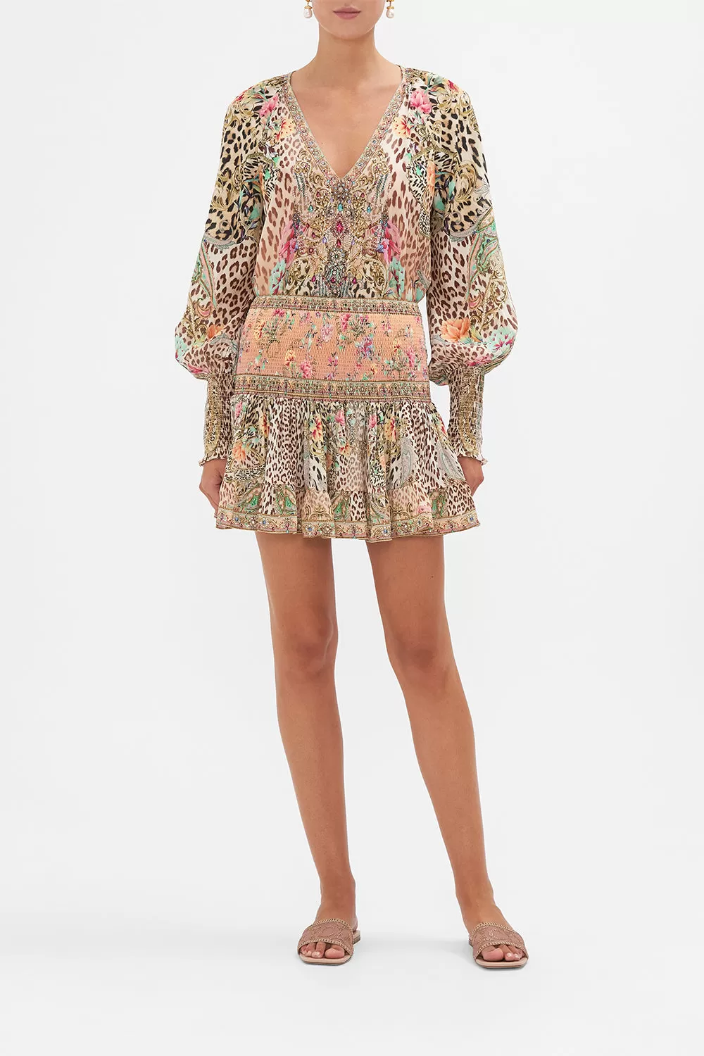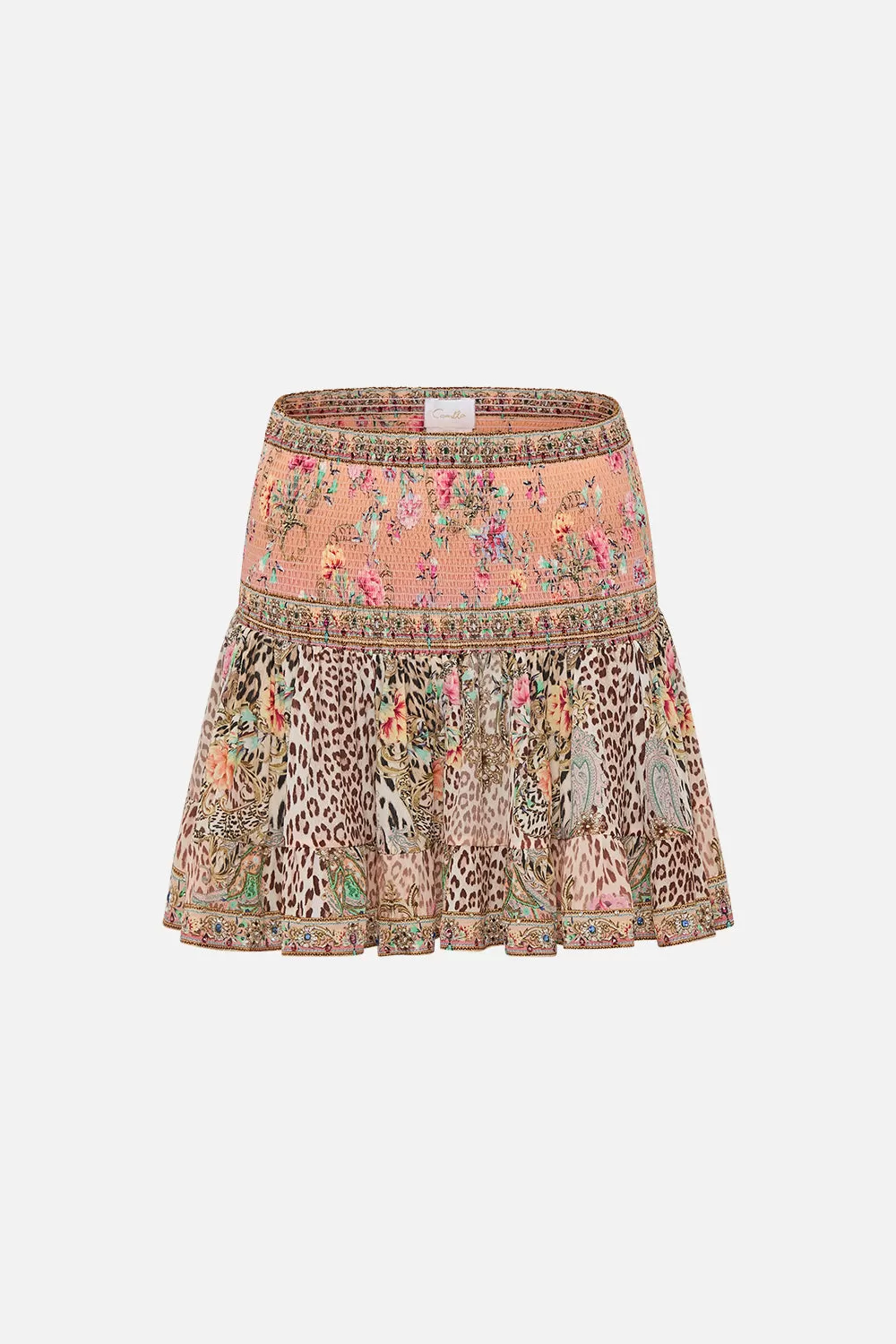 The Queen Atlantis Short Shirred Skirt brings back a classic with timeless leopard print finished with petals dipped in blush hues, roped accents and gold baroque detailing. Adorning hand-embellished CAMILLA crystals, this luxury silk mini skirt is finished with a cropped length, a shirred waistband that cinches and shapes and a relaxed ruffle hemline.