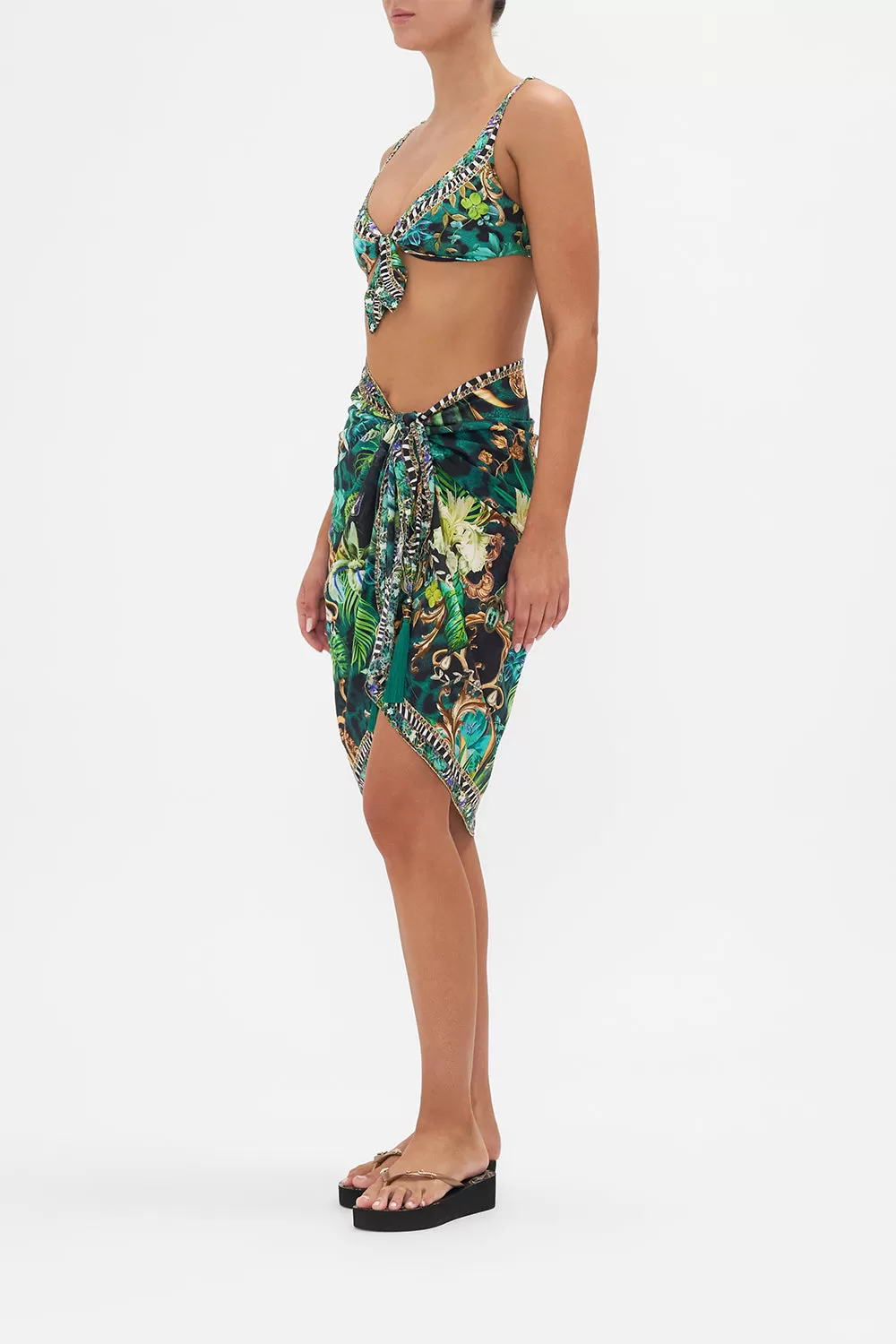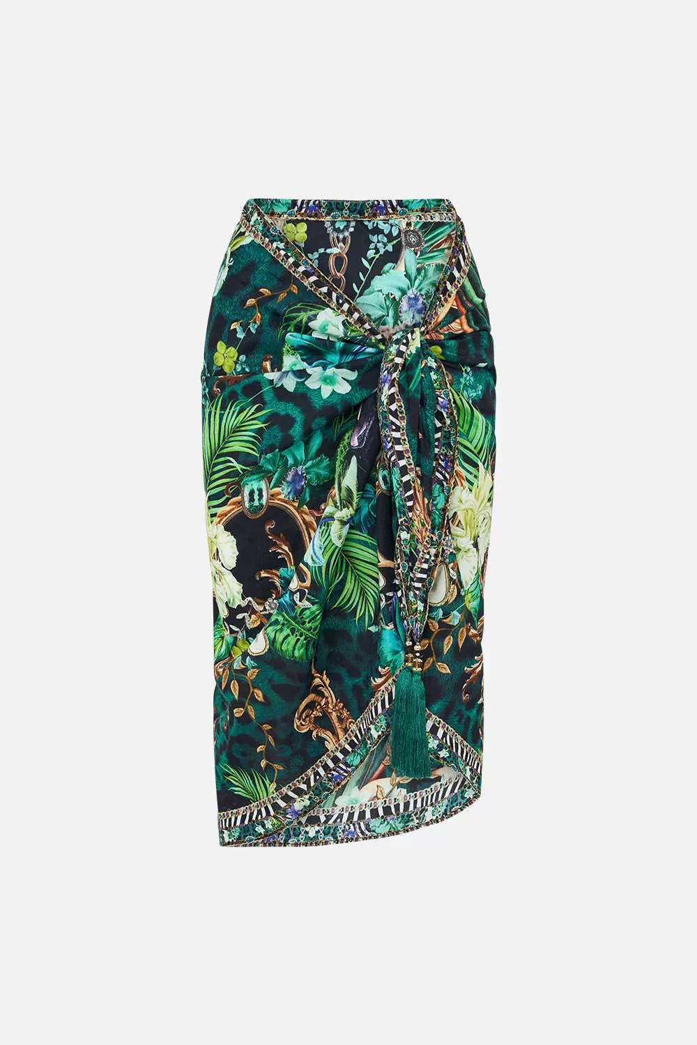 The Sing My Song Short Tassel Sarong explores lush jungle green hues of unfurling foliage. Vibrant flora and sleek feline fauna guard fine strands of sparkling amulets, precious emerald jewels, and winding vines of golden sprigs. Crafted from a cotton-silk blend, this luxury sarong wrap is home to a multi-wear design complete with tie-up fastening, gold tassel detailing that shimmers amidst the sun and a contrast panel trim. Lovingly crafted and designed in Australia, explore more from The Moral Of The Story: Act II collection.