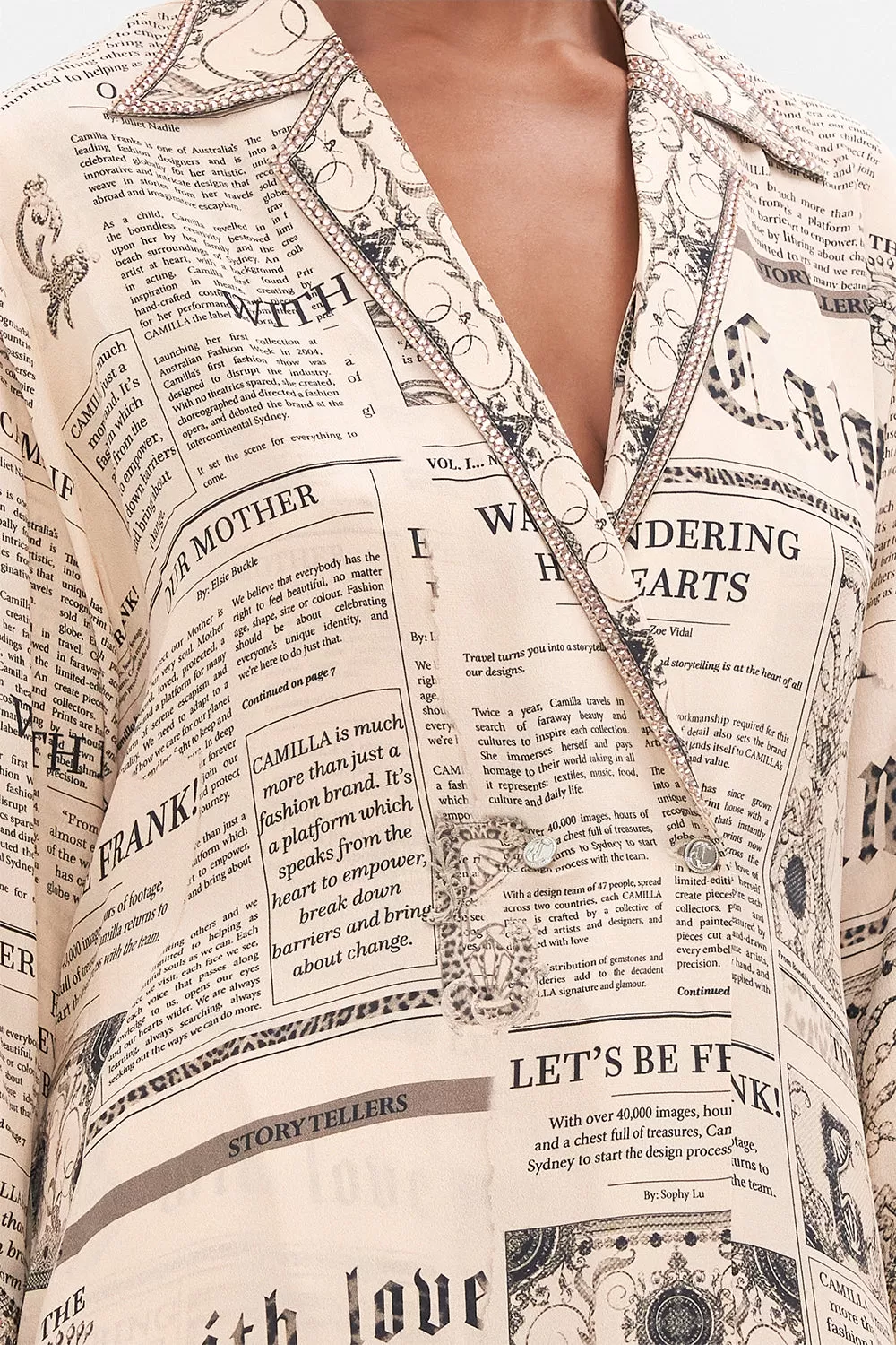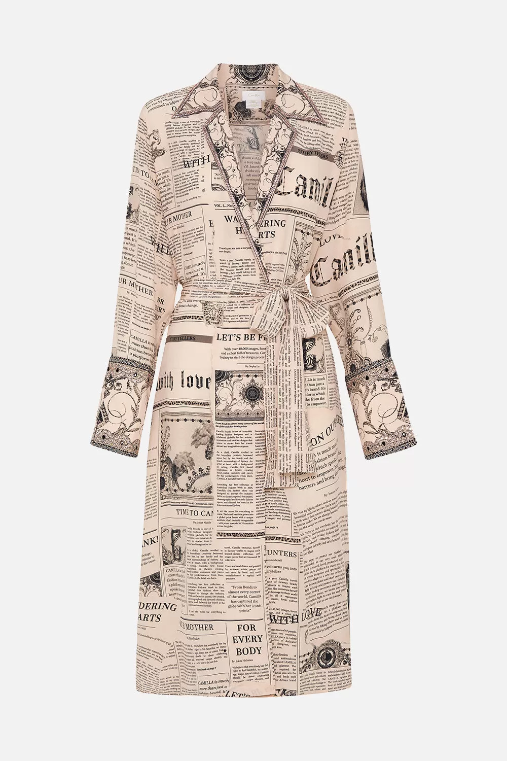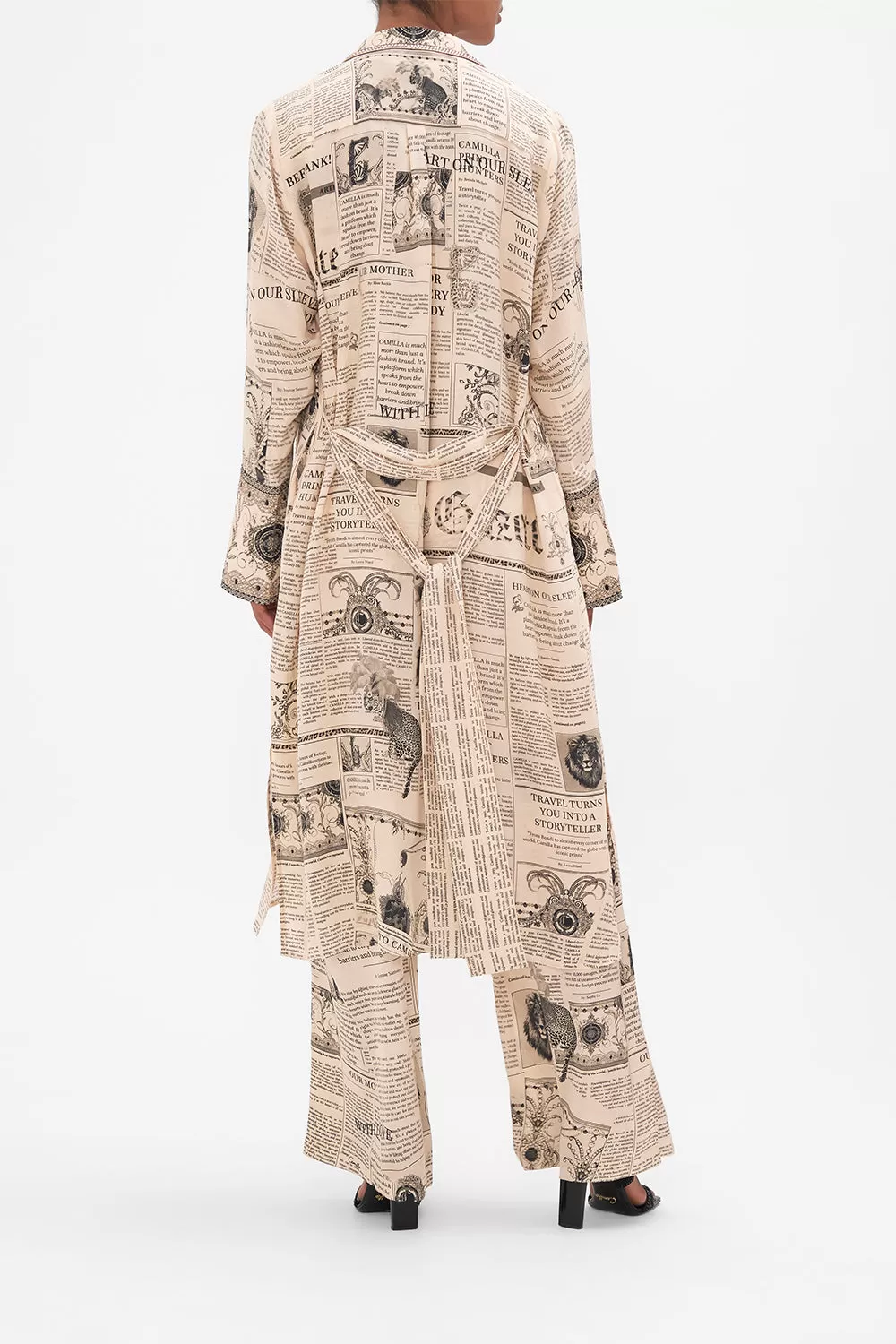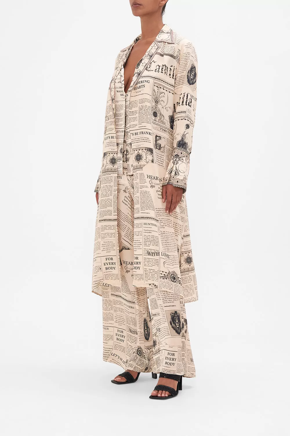 The Fame Fever Split Cuff Soft Coat is an immersion of drama and audience captivating headlines set against soft sepia tones. Crafted from a decadent CAMILLA printed silk, this luxury lightweight coat is home to embellished lapels and split cuff details, a tie to cinch in and accentuate the waist, structured shoulders to add shape and definition, and a relaxed boxy silhouette that falls into a midi length hemline. Lovingly handcrafted and designed in Australia, explore more from The Moral Of The Story: Act II collection.