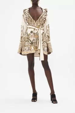 The Road To Richesse Split Cuff Jacket explores a mesmorising sea of ivory white hues finished with ornate golden swirls that dance alongside decadent botanical details and exquisite chain cascades. Crafted from breathable viscose, this luxury jacket is home to a statement lapel dipped in hand-embellished CAMILLA crystals, a tantalilsing wide cuff that dances at the wrist and a matching waist-tie that completes button hardware.