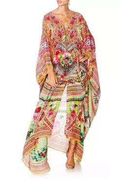 Combining style and elegance, this Split Hem Lace Up Kaftan will make a decorative addition to your luxury resort wear wardrobe. In a flattering full-length cut with a high-low hemline and a deep centre front split, this dress is accentuated with a plunging lace-up neckline and wide loose cut sleeves. Taking you from dinner to drinks, accessorise this stunning dress with a and long for a statement look this season.