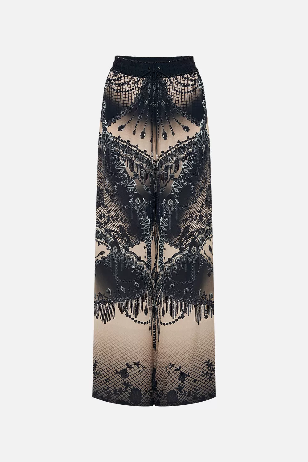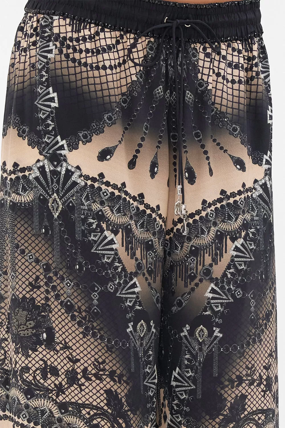 The Curtain Call Chaos Straight Leg Pant interweaves the fine lines of netting and french lace, draped chains, dripping in black diamond gemstone motifs. Crafted from the luxury of CAMILLA silk, this statement pant plays host to an elasticated drawstring waist to add cinching definition, an ankle-grazing wide leg that enables effortless movement and hand-embellished crystals to glisten with every step. Lovingly handcrafted and designed in Australia, explore more from The Moral Of The Story: Act II collection.
