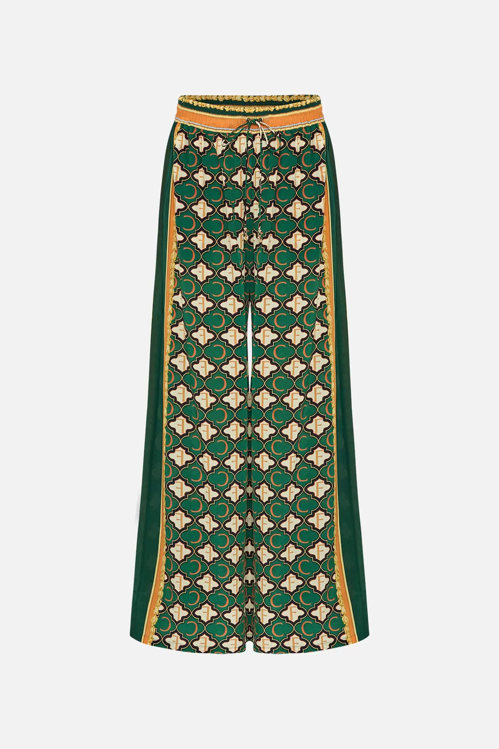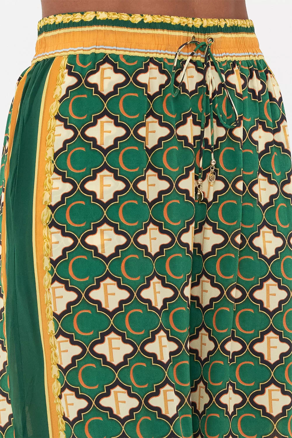 The Jealousy & Jewels Straight Leg Pant commands a rhapsody of geometric mosaics, featuring a gilded monogram motif set in vibrant emerald green and black. Crafted from the luxury of CAMILLA silk, this statement pant plays host to an elasticated drawstring waist to add cinching definition, an ankle-grazing wide leg that enables effortless movement and hand-embellished crystals to glisten with every step. Lovingly handcrafted and designed in Australia, explore more from The Moral Of The Story: Act II collection.
