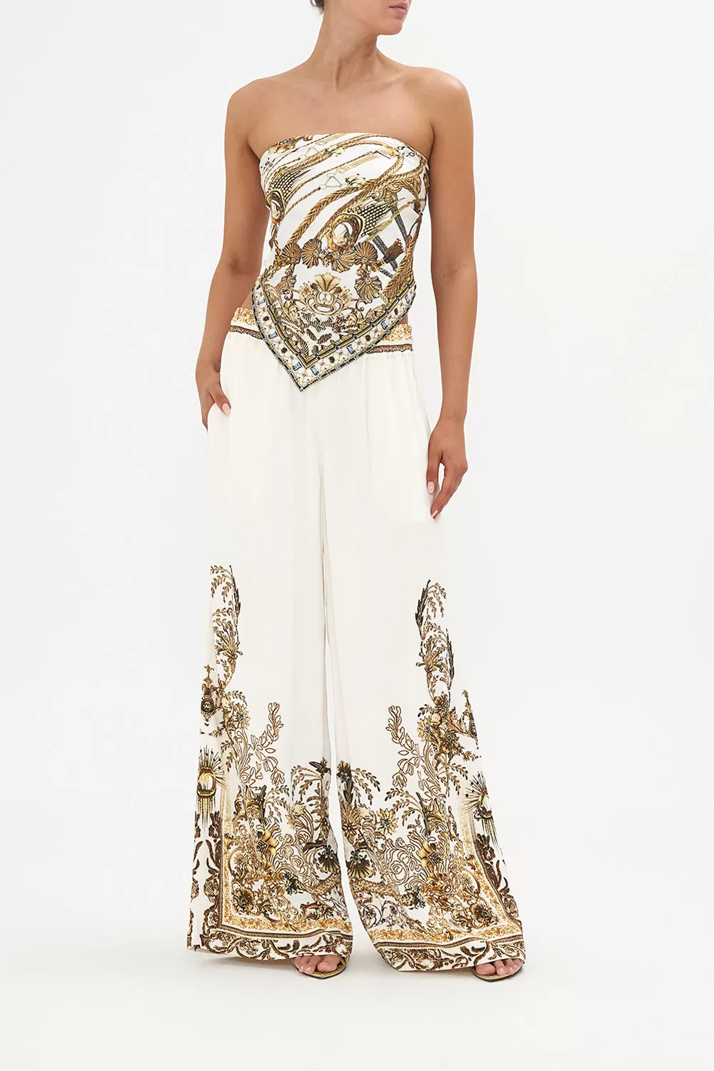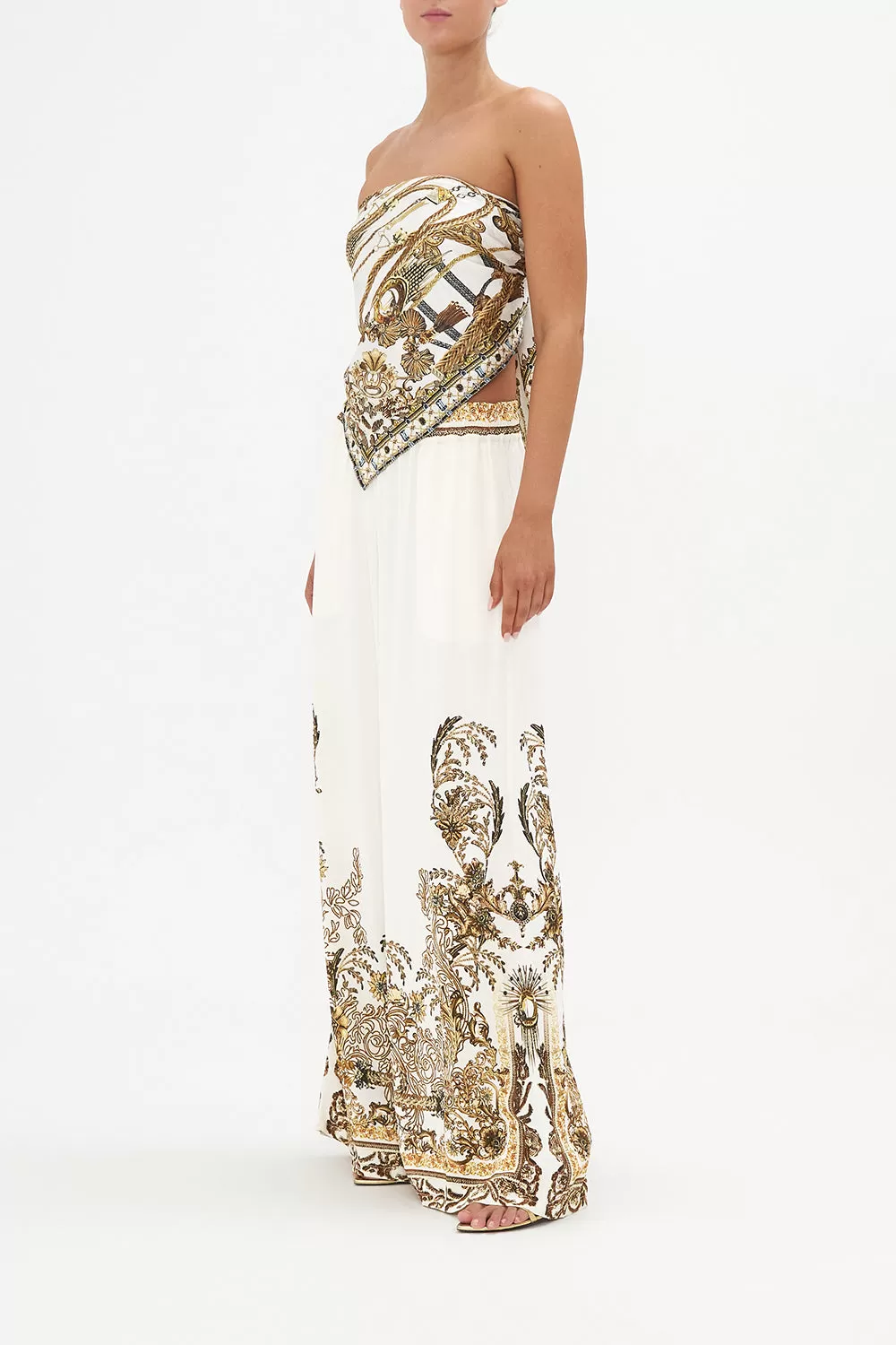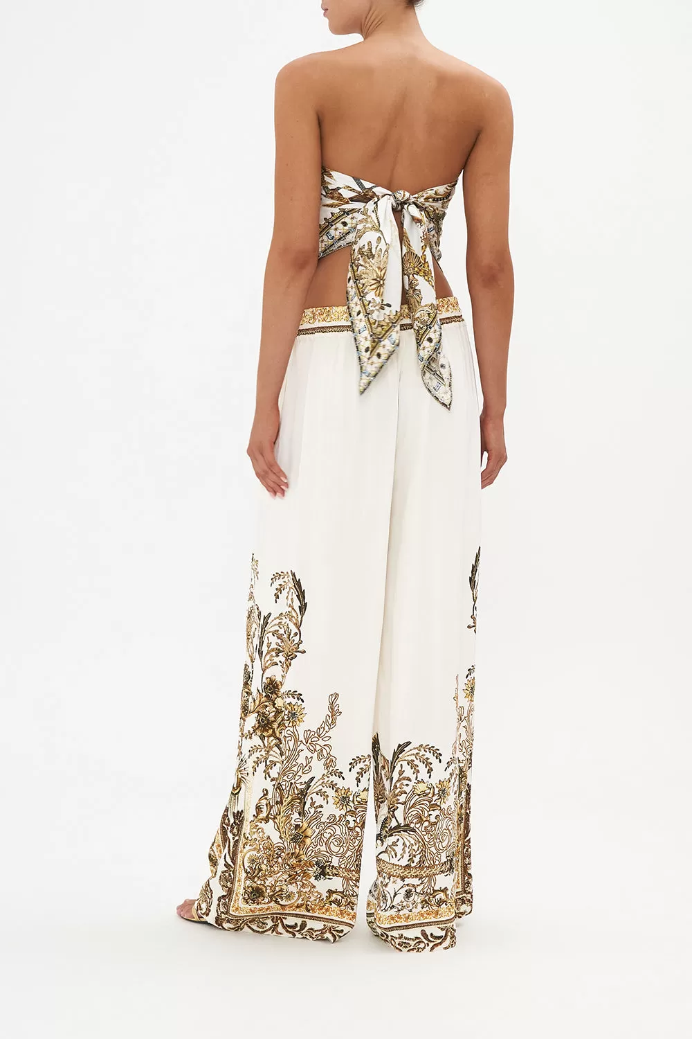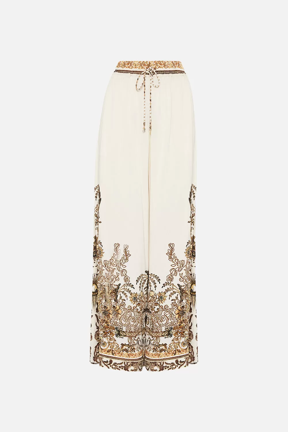 The Road To Richesse Straight Leg Pant explores a mesmorising sea of ivory white hues finished with ornate golden swirls that dance alongside decadent botanical details and exquisite chain cascades. Crafted from breathable CAMILLA viscose, this statement pant plays host to an elasticated drawstring waist to add cinching definition, an ankle-grazing wide leg that adds indescribable movement and hand-embellished crystals to glisten with every step.