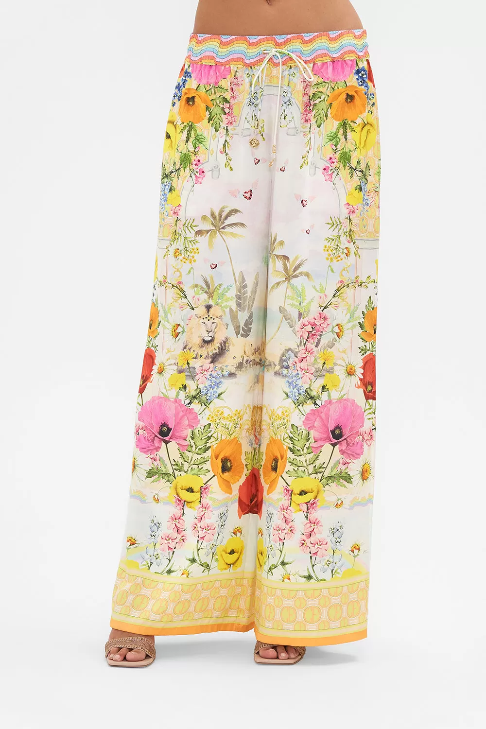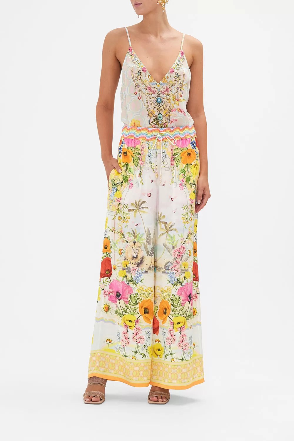 The Sunlight Symphony Straight Leg Pant captivates the eye with a soft pink hue finished with poppies wrapped in gentle blues, carnations in blushing tones and the delicate cascade of leafy vines. Crafted from the luxury of CAMILLA silk crepe, this statement pant plays host to an elasticated drawstring waist to add cinching definition, an ankle-grazing wide leg that adds indescribable movement and hand-embellished crystals to glisten with every step.