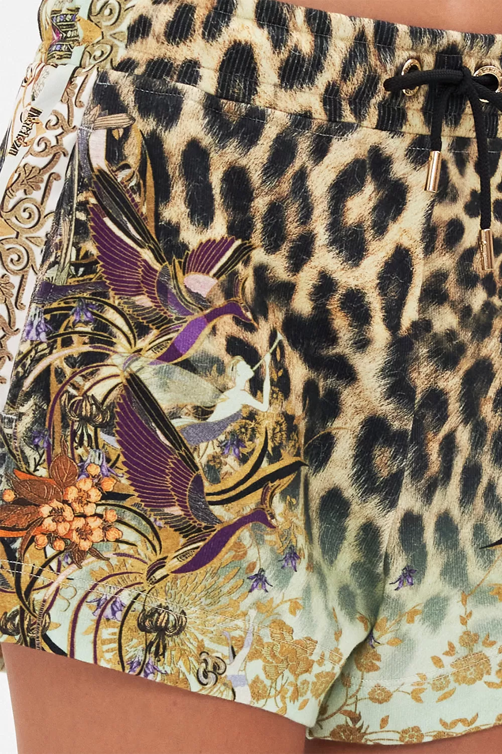 The Nomadic Nymph Terry Short With Contrast Stripe steals our gaze with a vision in sandy leopard print finished with soft blends of icy blues, vines of golden foliage and birds of ethereality that dance amidst breathtakingly decadent nymphs. Crafted from breathable cotton, these luxury shorts play host to an elasticated drawstring waist that marries scintillating gold hardware and a relaxed mini silhouette that dances at the thigh.