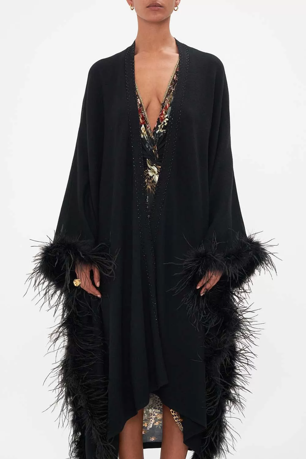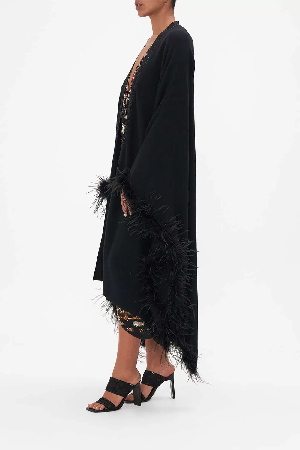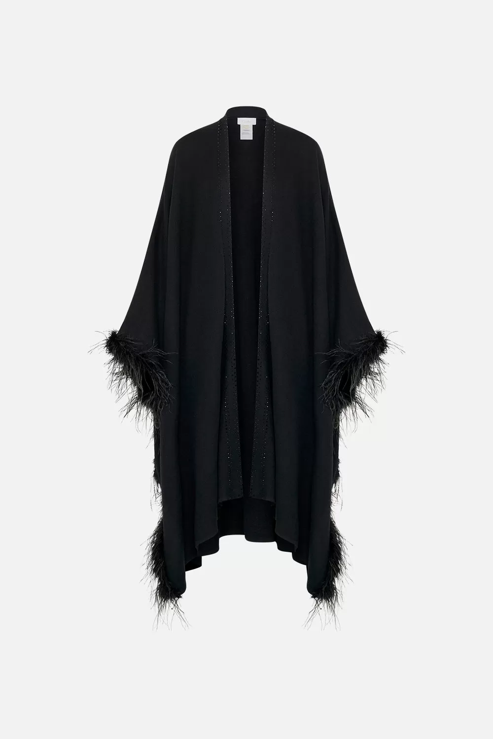 The A Night At The Opera Throw Over With Feathers echoes the sweet symphony of deep black hues accentuated with feathered decadence. Crafted from sumptuous merino wool, this luxury throw over plays host to a wrap-style silhouette that falls into a midi draped hemline, embellished with CAMILLA crystals, luscious feather accents and a relaxed cut that slips on effortlessly. Lovingly handcrafted, designed in Australia. Explore more from the Amore Mio collection.