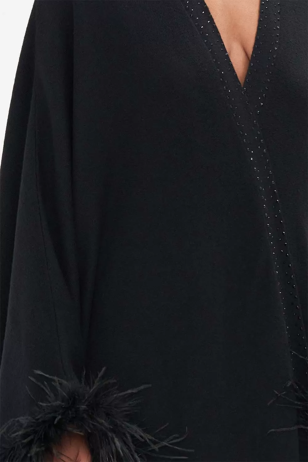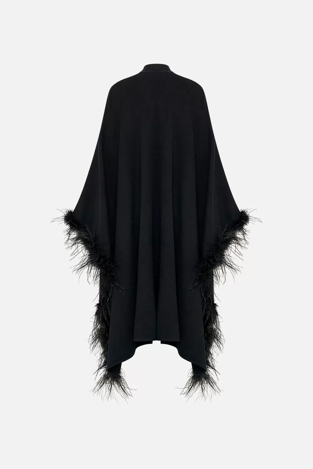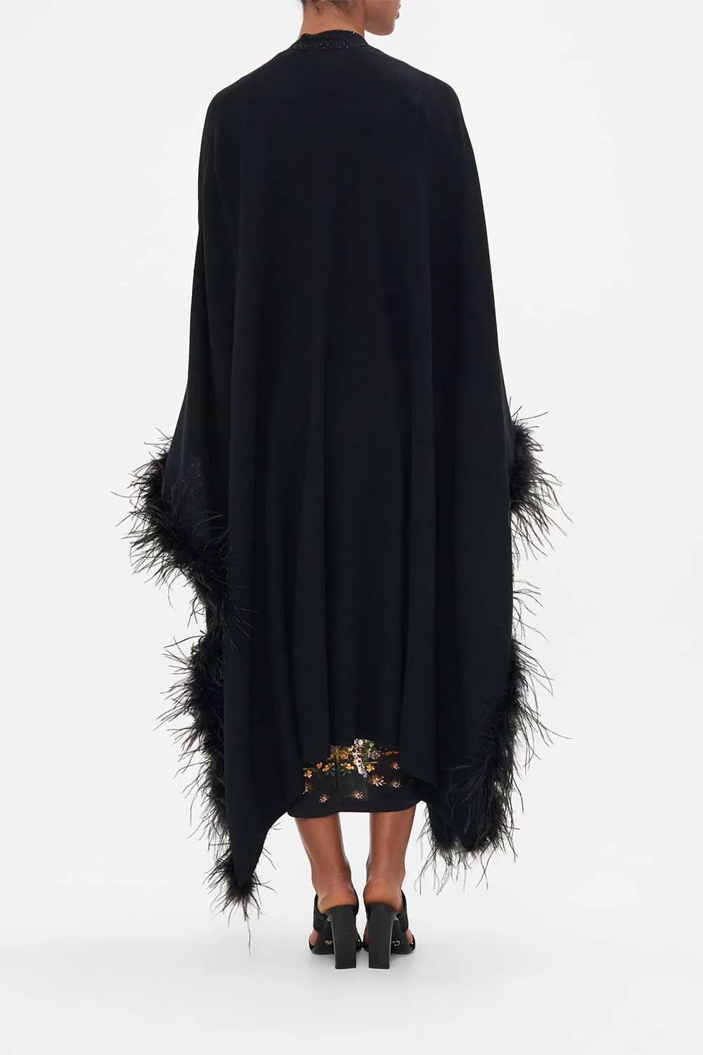 The A Night At The Opera Throw Over With Feathers echoes the sweet symphony of deep black hues accentuated with feathered decadence. Crafted from sumptuous merino wool, this luxury throw over plays host to a wrap-style silhouette that falls into a midi draped hemline, embellished with CAMILLA crystals, luscious feather accents and a relaxed cut that slips on effortlessly. Lovingly handcrafted, designed in Australia. Explore more from the Amore Mio collection.