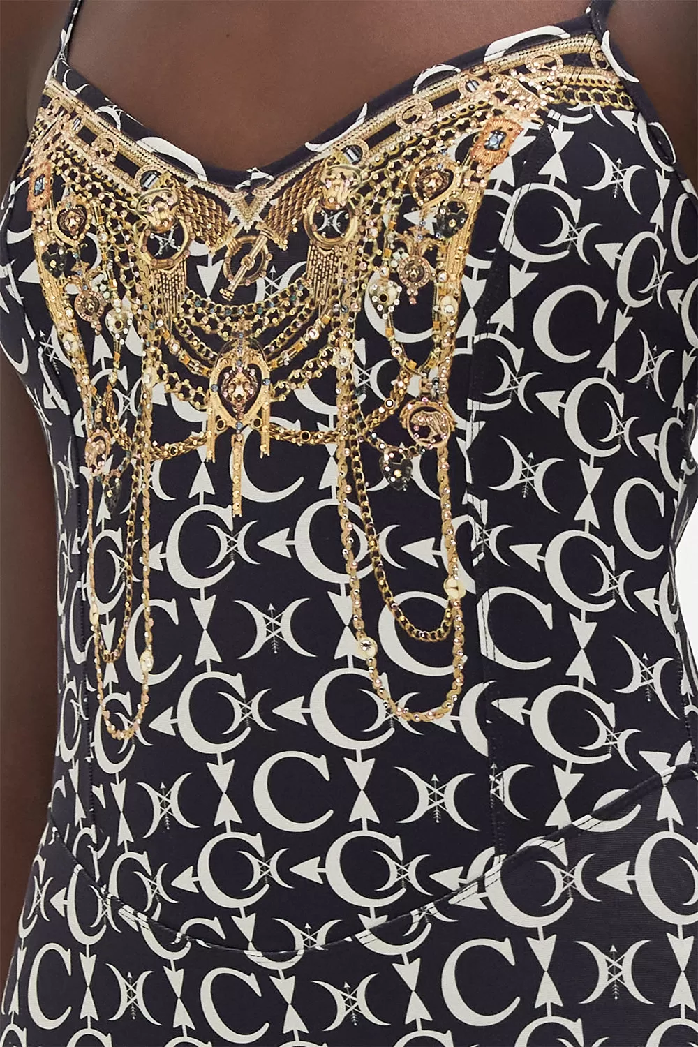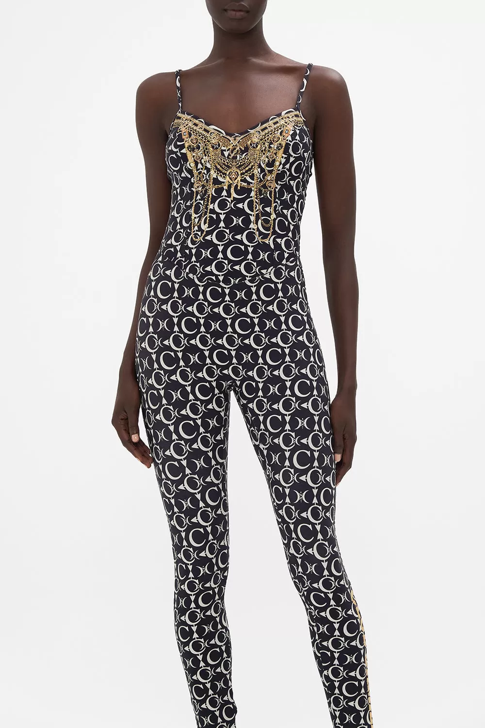 The Leo’s Sky V Neck Catsuit is enwrapped by a monochromatic mosaic that dips into a palette of black and white before being finished with our signature namesake initialling, iconography and CLUB CAMILLA detailing. Designed as a tantalising take on luxe activewear, this luxury catsuit comes complete with a panelled bodice to elongate the waist, customisable straps for your most perfect fit and a full-length pant length.