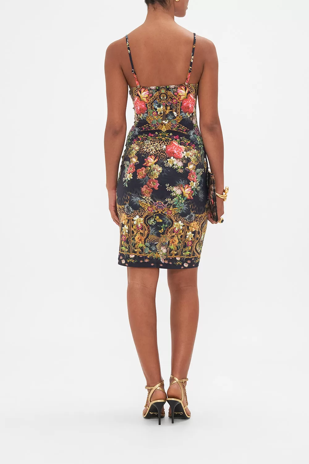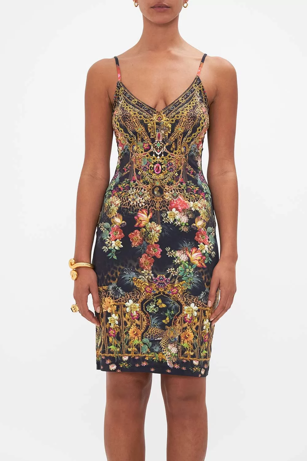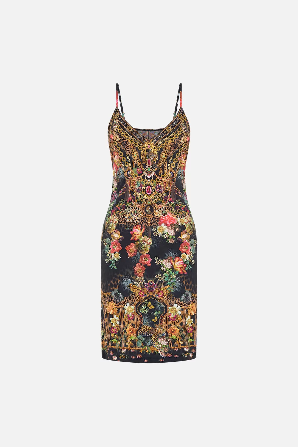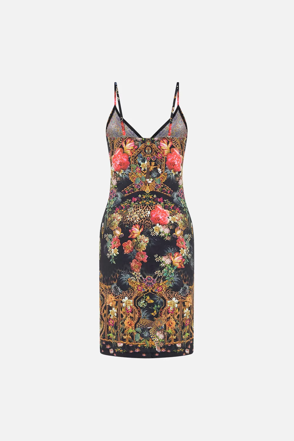The A Night At The Opera V Neck Slip echoes the sweet symphony of frescoes adorning opulent florals, ethereal cherubs and grand gilded archways. Crafted to caress the curves, this luxury slip dress plays host to a slim fit silhouette that falls into a mini hemline, a deep v neckline that meets contrast trim and adjustable rouleau straps. Lovingly crafted, designed in Australia. Explore more from Amore Mio collection.