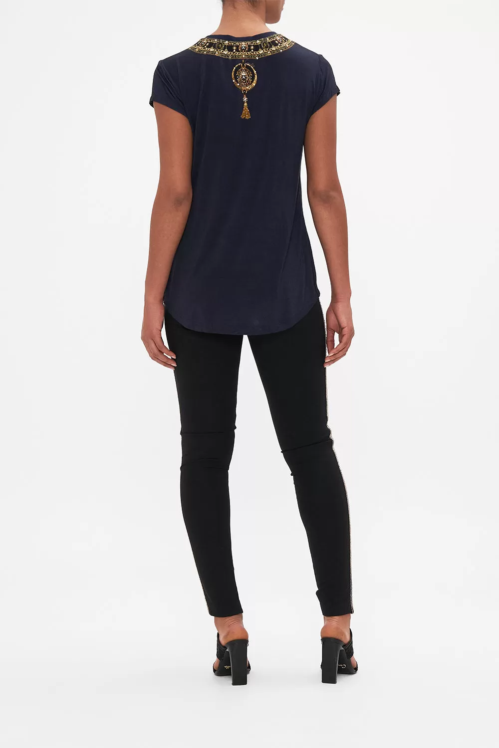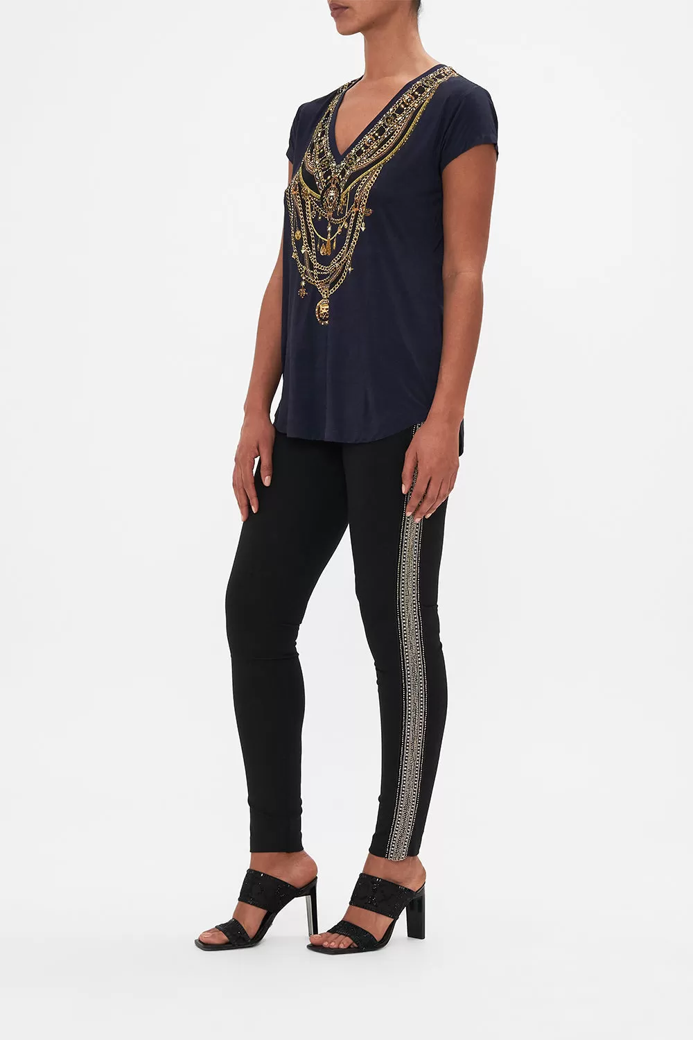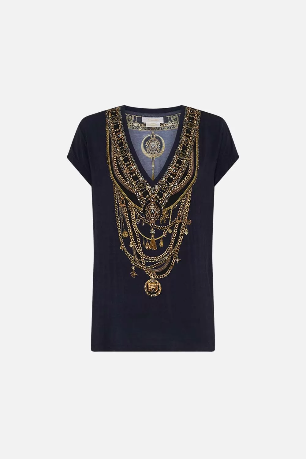 The Duomo Kaleido V Neck Tee celebrates the baroque details synonymous with the opulence of grand Italian duomos. Crafted with crystal embellishments, this luxury tee features a sleek v neckline, cropped sleeves, a relaxed loose-fit silhouette and a softly curved hemline. Pair with the Duomo Kaleido Straight Leg Track Pant for effortless casual chic. Lovingly handcrafted, designed in Australia. Explore more from the Amore Mio collection.