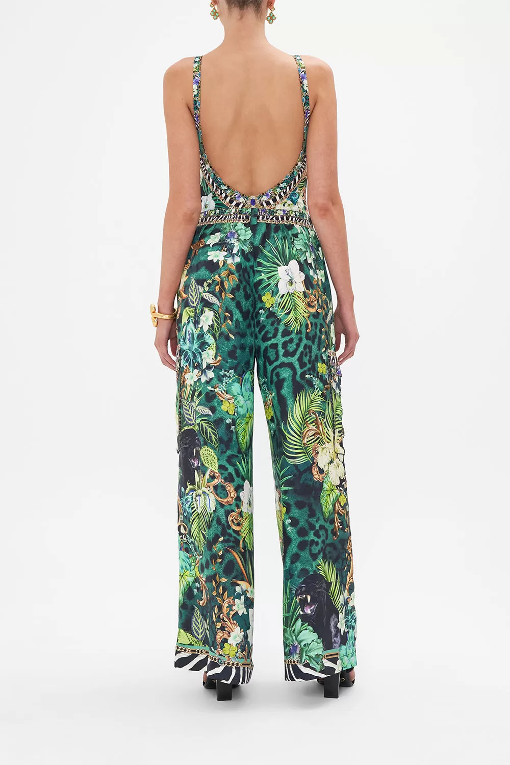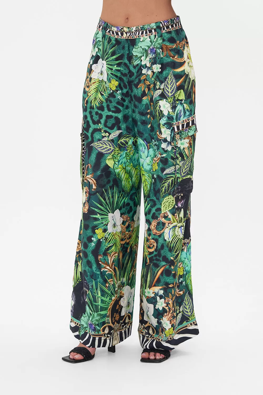 The Sing My Song Wide Leg Utility Pant explores lush jungle green hues of unfurling foliage. Vibrant flora and sleek feline fauna guard fine strands of sparkling amulets, precious emerald jewels, and winding vines of golden sprigs. Crafted from the softness of silk, these relaxed fit luxury pants are home to statement wide legs that adorn effortless side pocket detail, hand-embellished crystals, a high waistband with shirred back, and finely finished with CAMILLA hardware. Lovingly handcrafted and designed in Australia, explore more from The Moral Of The Story: Act II collection.