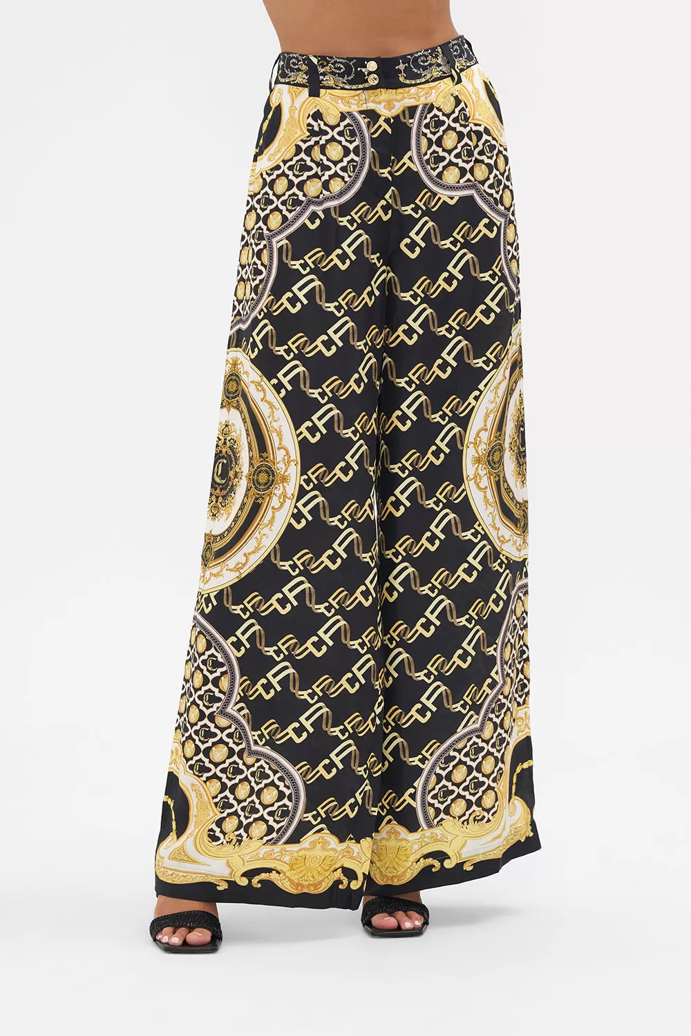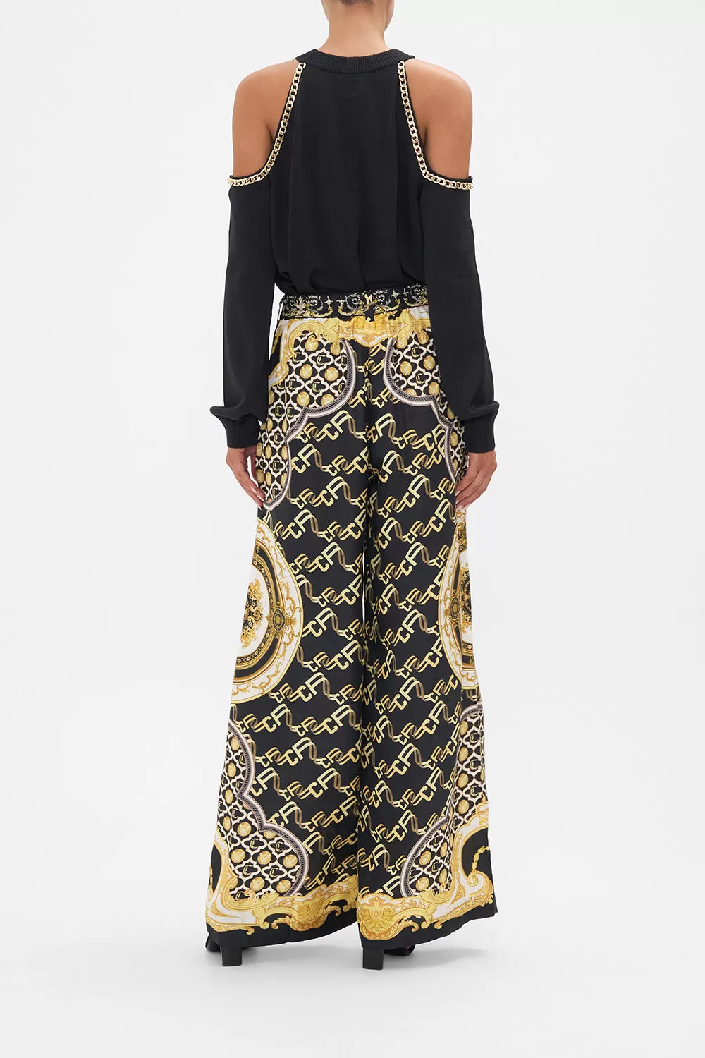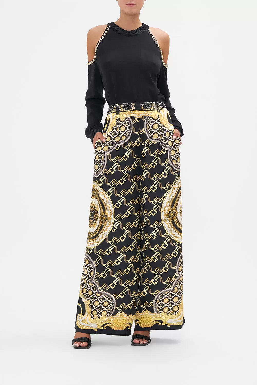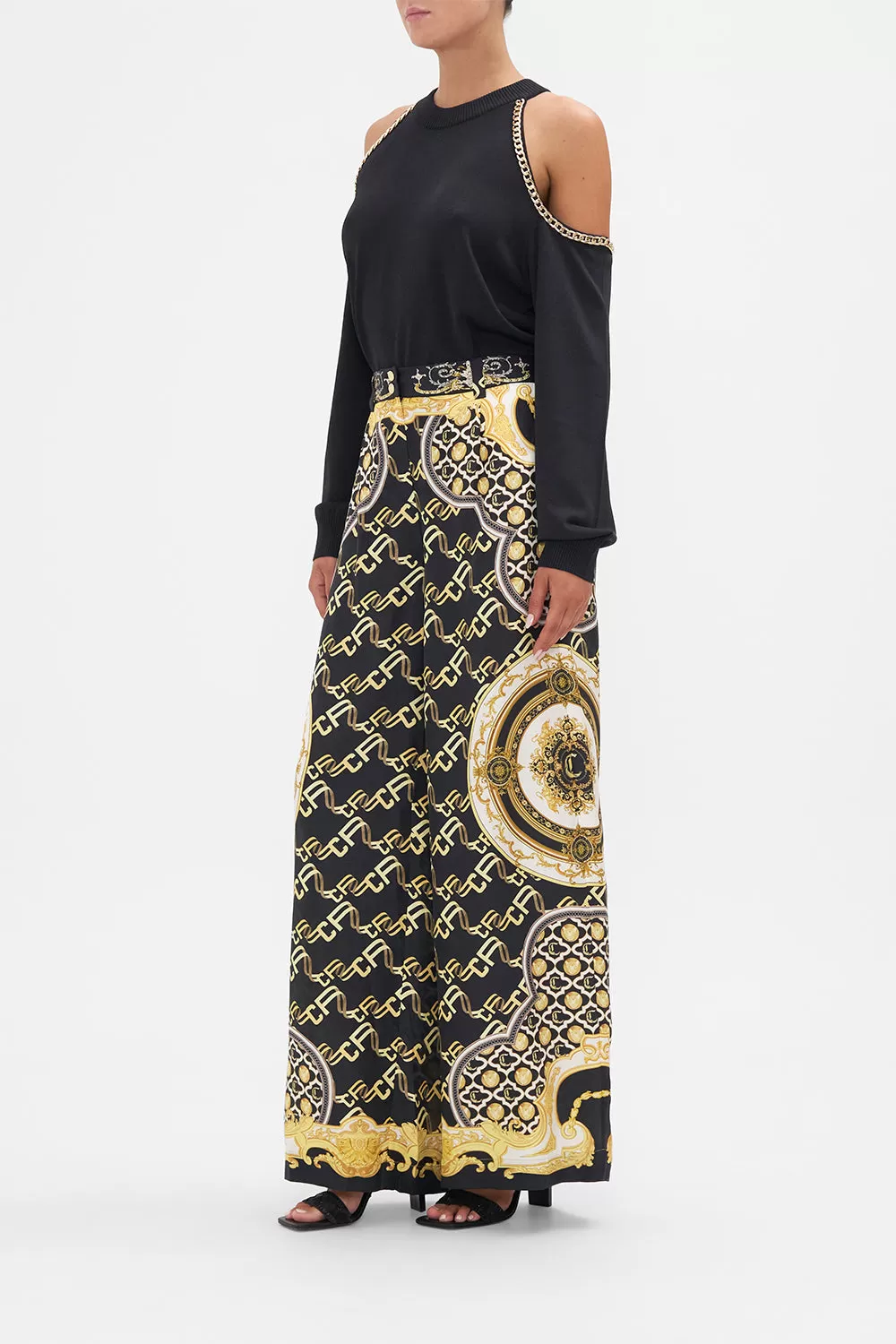 The Tether Me Not Wide Leg Waisted Pant is an immersion into an opulent world of sleek palatial curves, offset with sharp monogram mosaics. Gilded baroque adornments and chains glimmer against graphically bold onyx and ivory contrasts. Crafted for everyday elevation, these luxury pants are home to a contrasting waistband to cinch and shape, a voluminous wide leg, a full-length relaxed silhouette and pocket functionality. Lovingly handcrafted and designed in Australia, explore more from The Moral Of The Story: Act II collection.